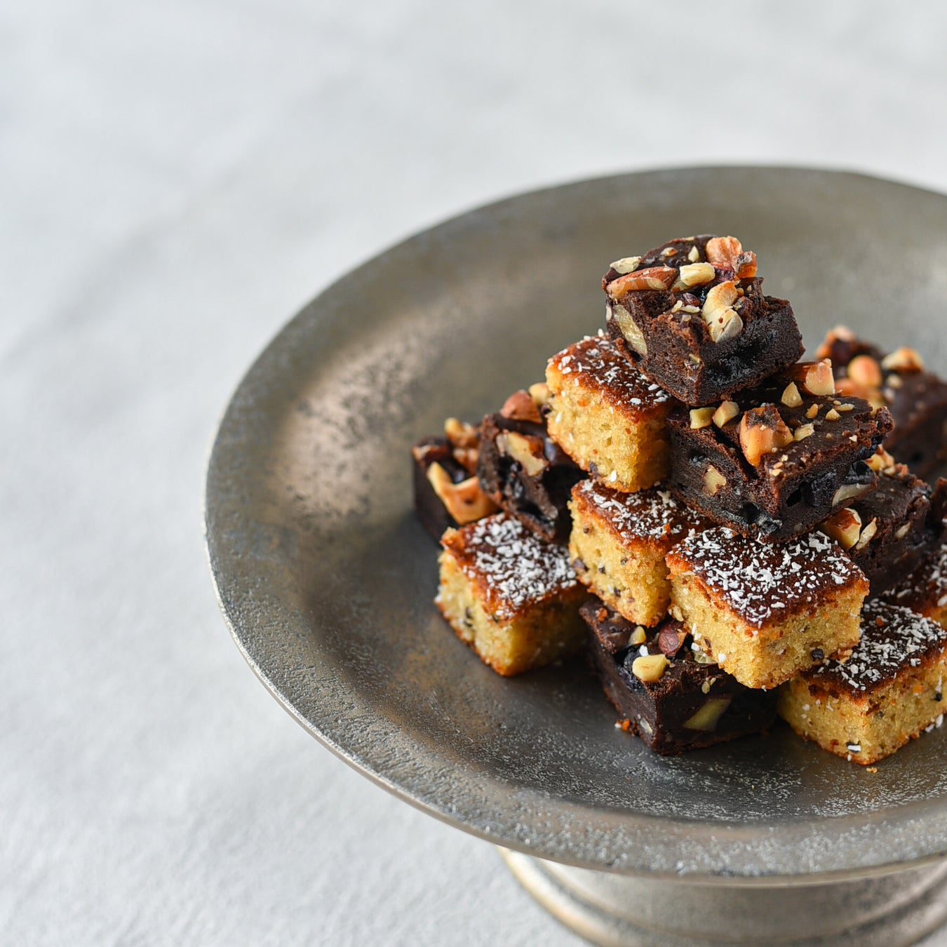 ひとくちサイズの米粉と豆腐を使用したナッツたっぷりガトーショコラと、香り高いバナナとココナッツの米粉パウンドケーキです。(2種×各2個入り)