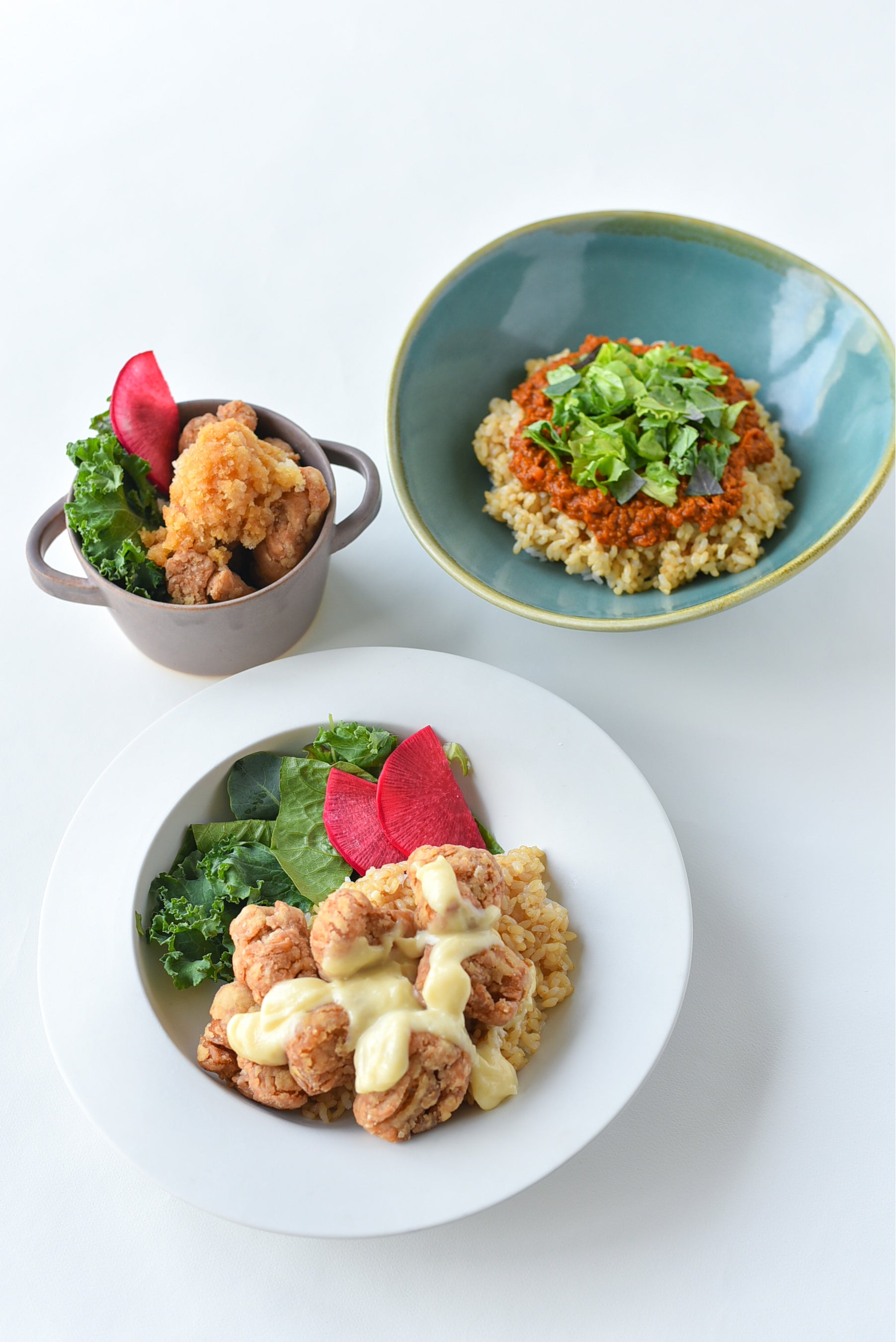 2種の味から選べる大人気のソイミートのからあげ丼。自家製味噌豆乳マヨネーズと和風おろしぽんず、または2種のMIXからお選びいただけます。厳選玄米ごはんと共にお召し上がりください。