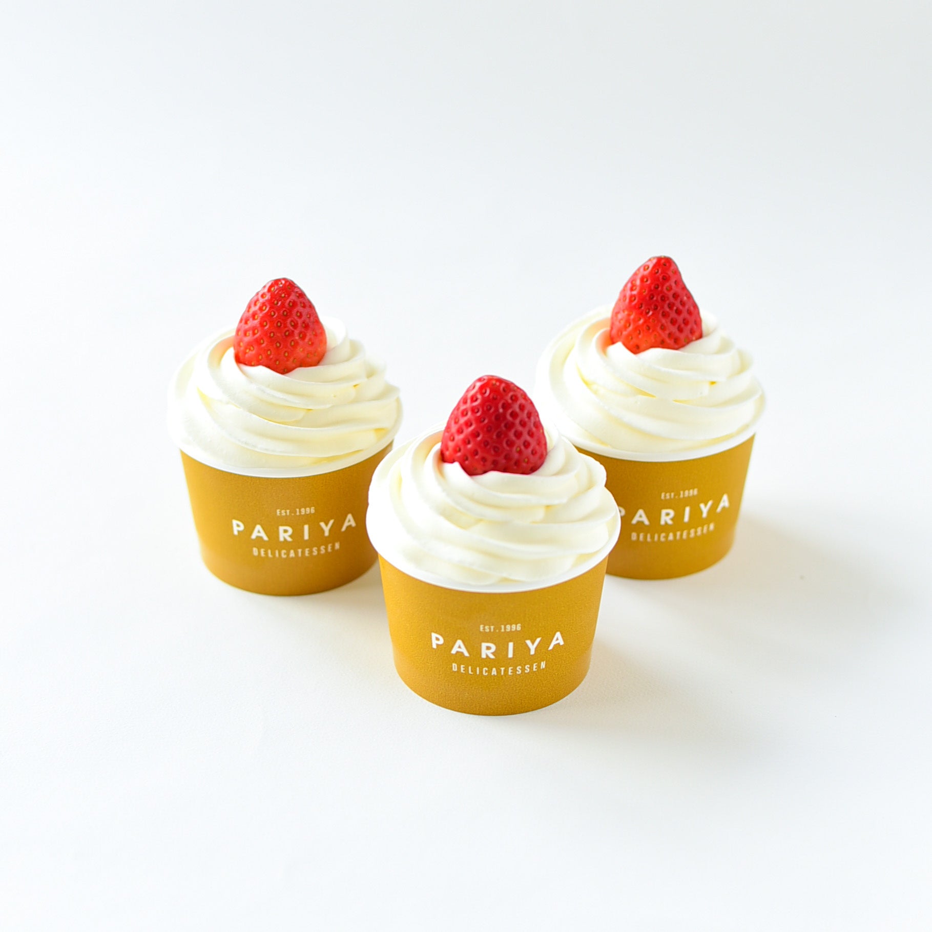 甘さ控えめな生クリームと軽い口どけのスポンジに、甘酸っぱい苺を合わせたPARIYA定番のストロベリークラシックショートケーキ。製造過程でロスになるスポンジを活用しミニカップサイズでご用意。