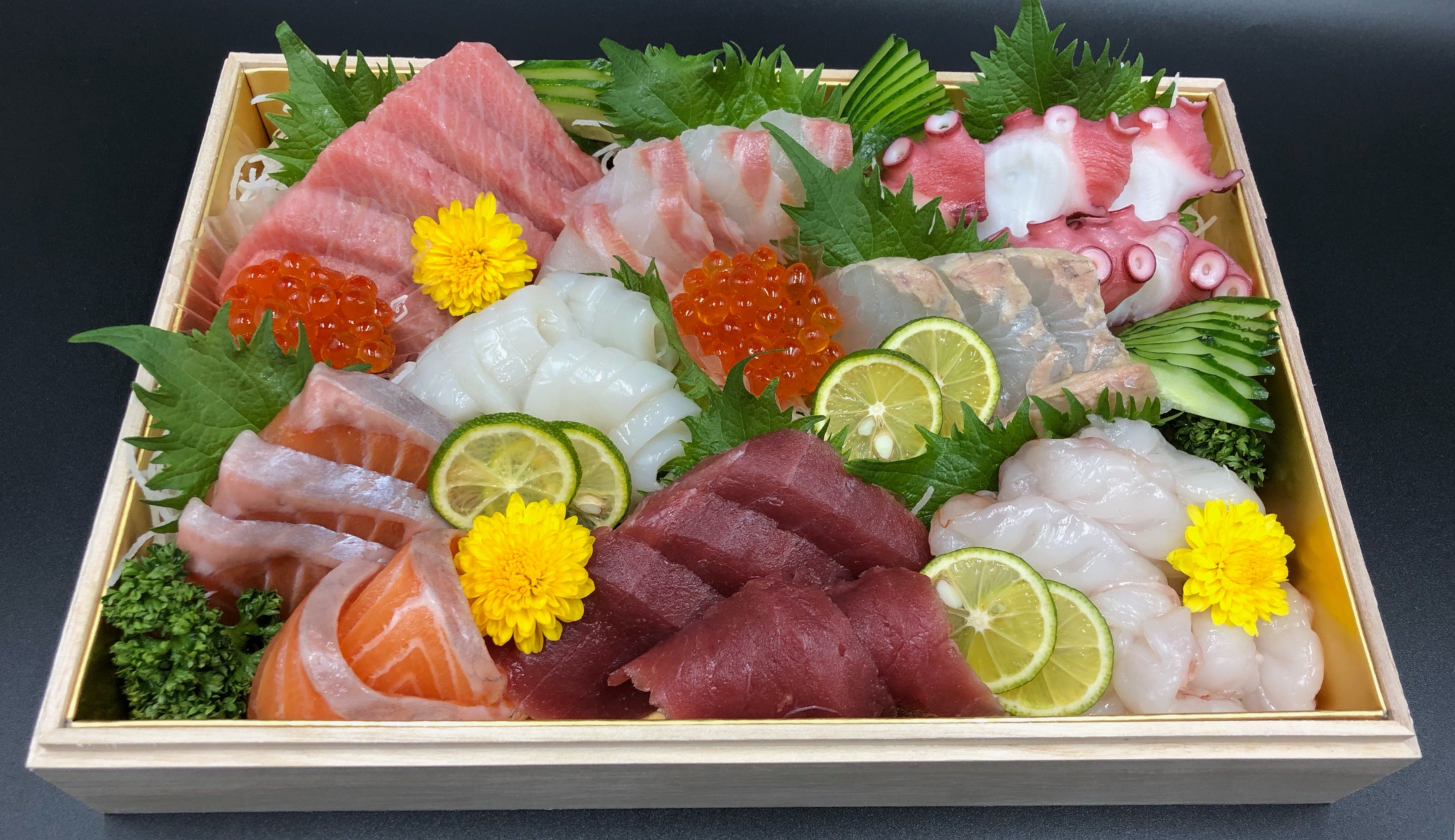 中でも人気の「刺身盛り合わせ予約」や豊洲の新鮮な魚を使った「寿司」「海鮮丼」が好評。