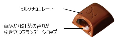 - 香り高いティーリキュールにブランデーを合わせて、口どけまろやかなミルクチョコレートで包んだ、一粒タイプの大人の本格洋酒チョコレートです。