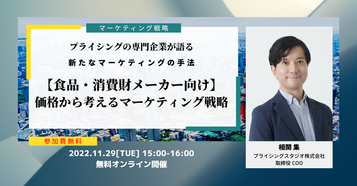 プライシングスタジオ株式会社(本社:東京都港区、代表取締役:高橋 嘉尋)は、無料オンラインセミナー【食品・消費財メーカー向け】価格から考えるマーケティングセミナーを11月29日(火)15時に開催いたします。