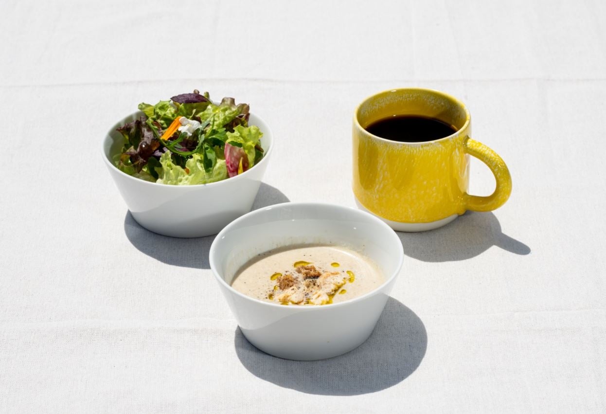 寒い朝におすすめ!季節野菜のポタージュ、有機のハーブを使用したミニサラダ、ドリンクがついたお得なセット。(トーストセット500円/税込)モーニングタイムにお好きなトーストと一緒にお召し上がりいただけます。