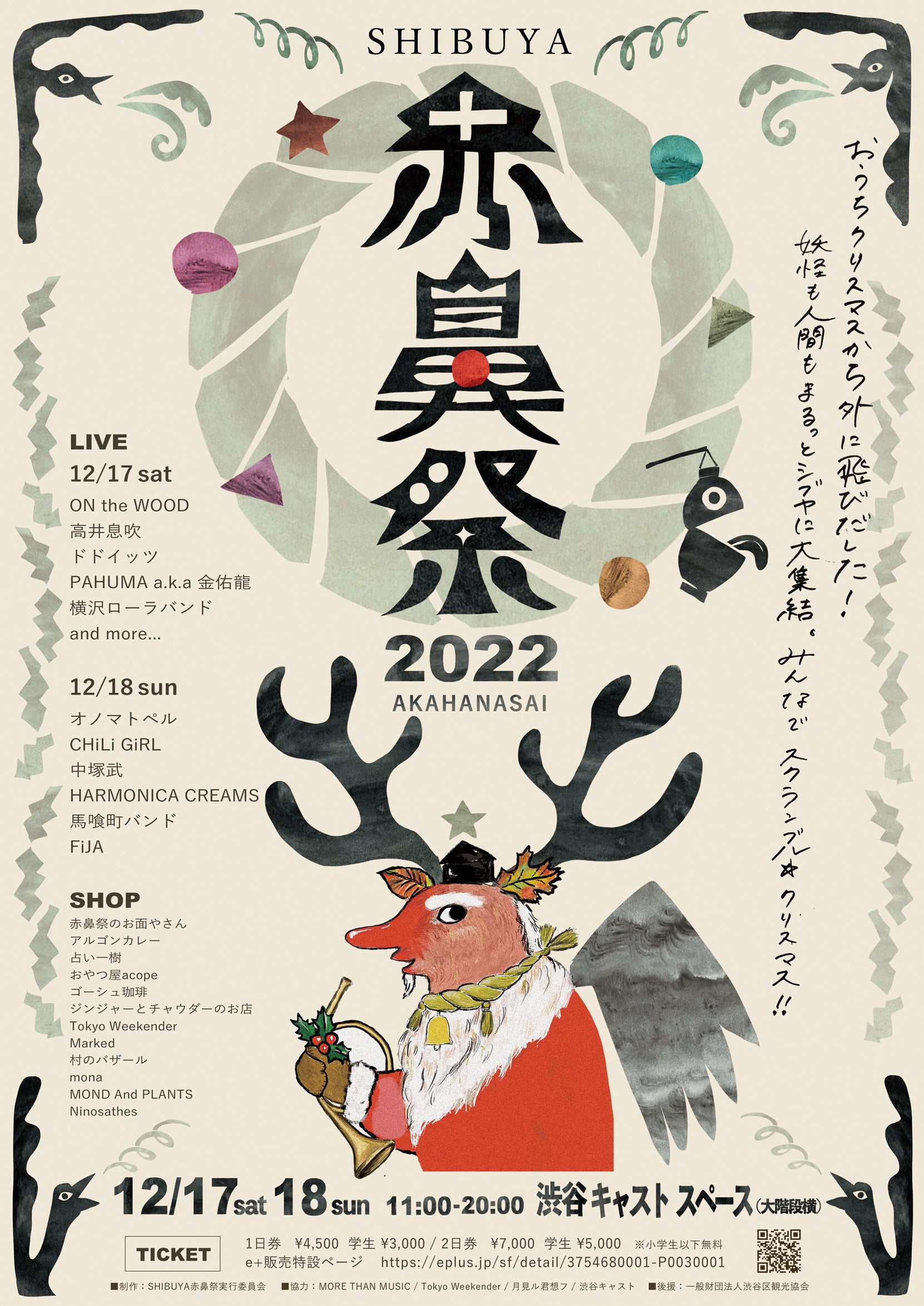 渋谷キャストのコミュニティメンバーでもあるシンガーソングライターの横沢ローラさんの呼びかけで、アーティスト、音楽関係者や外国人のコミュニティが結束し、SHIBUYA赤鼻祭実行委員会が発足。ビジュアルやネーミング含め、「クリスマスなのに一風変わった装い」のこの新しいお祭りらしい、摩訶不思議な装飾やオブジェが登場予定。気鋭のアーティスト・バンド12組のライブコンサートや渋谷キャストに店舗を構える「Marked 渋谷」ほか個性的な出店者が並び、渋谷キャストを終日楽しめる2日間となります。
