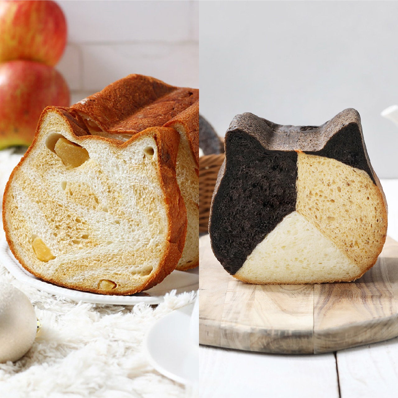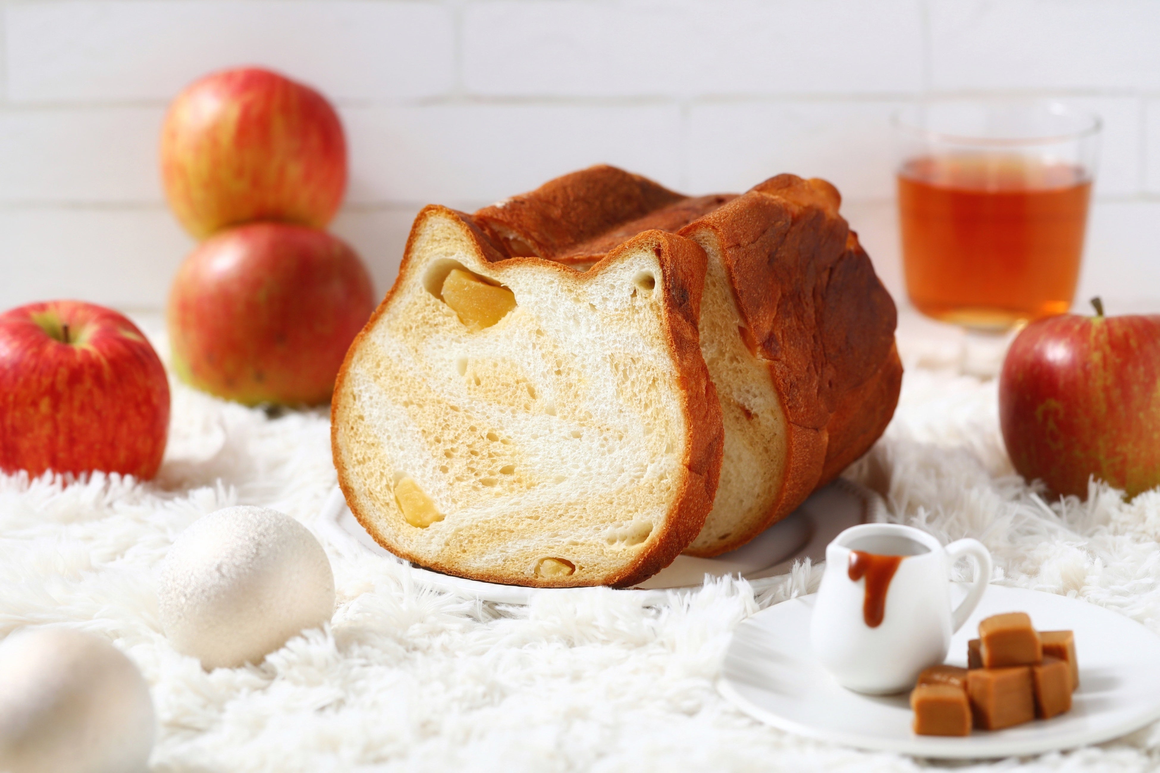 キャラメルの優しい甘みと、旬のりんごの素材の美味しさが特長のねこねこ食パンです。温かい紅茶などと一緒にゆったりとお召し上がりいただきたい、”ほっ”と一息つく味わいに仕上げました。
