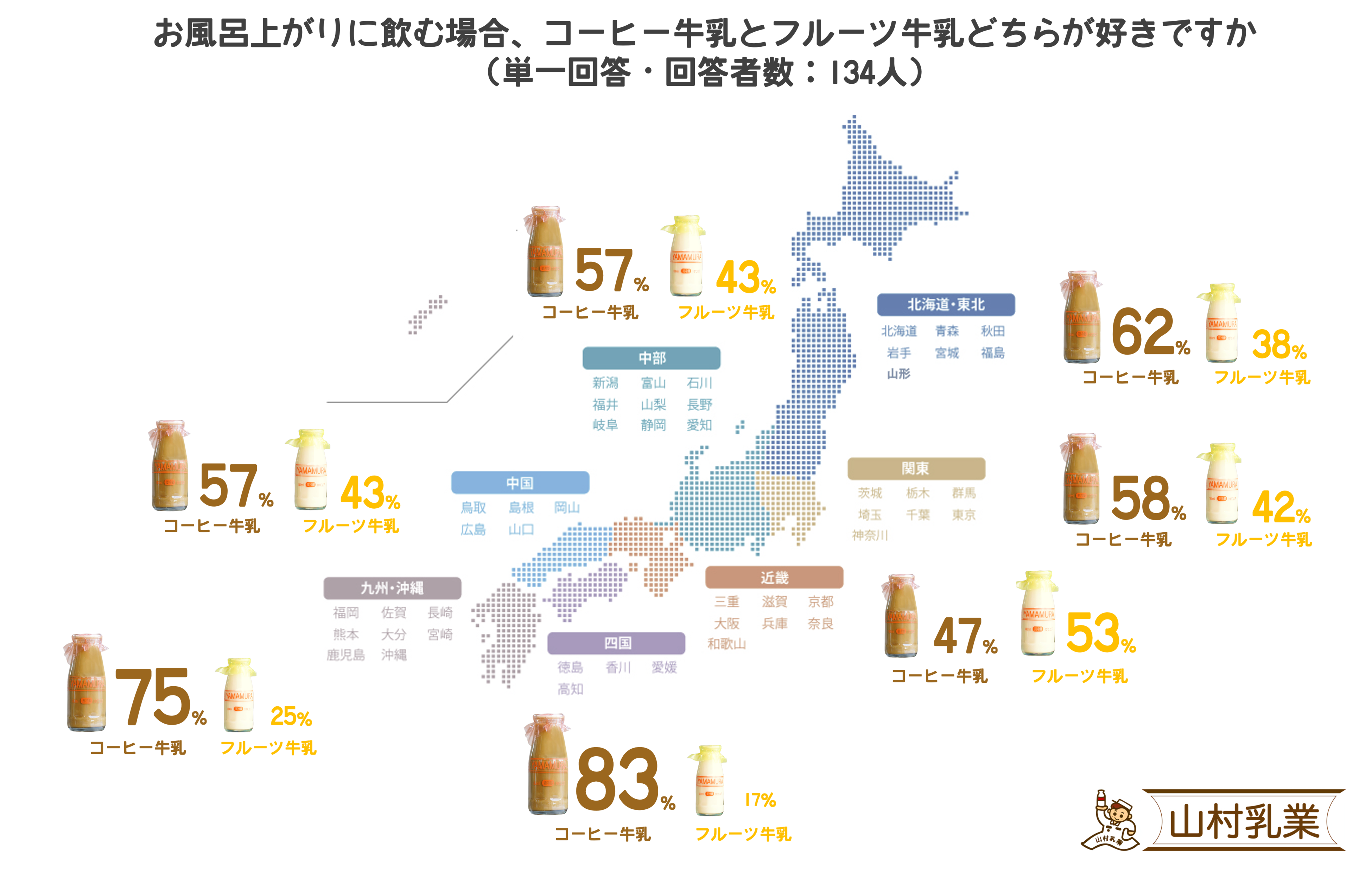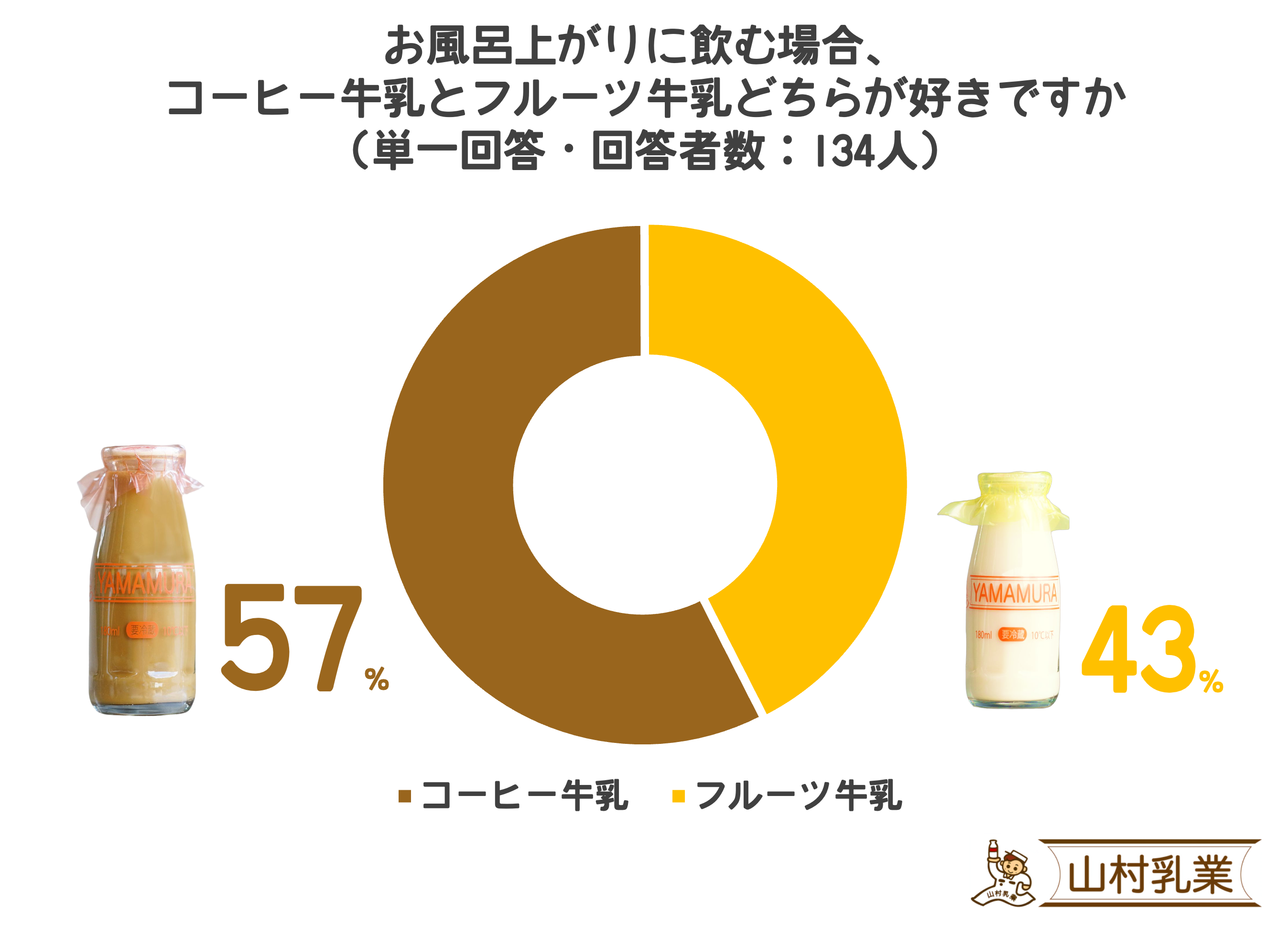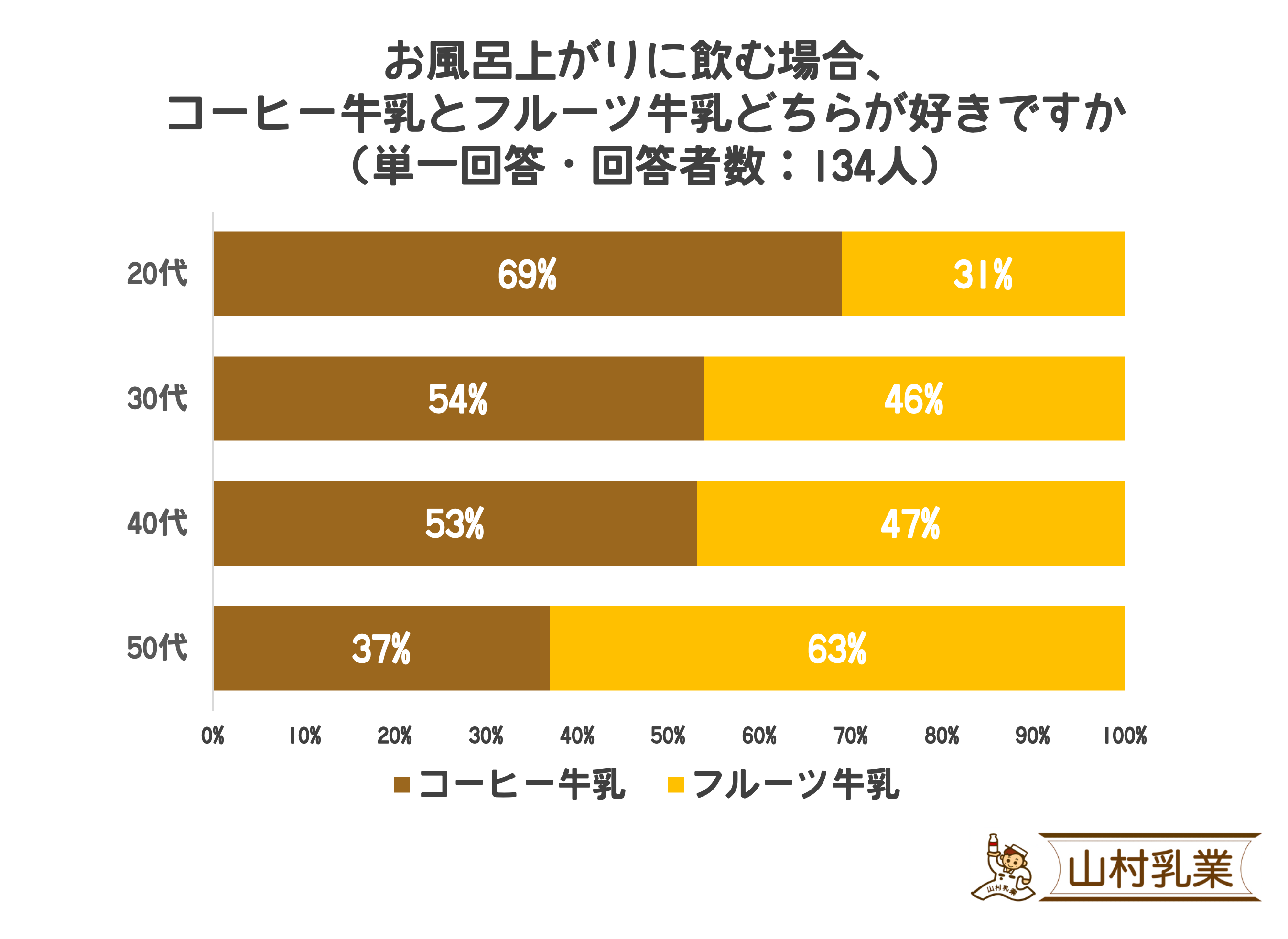 瓶入り乳製品の品数日本最多※、有限会社山村乳業(本社:三重県伊勢市大世古3丁目5-8、代表取締役:山村豊裕、以下弊社)は、乳飲料として長年親しまれてきたコーヒー牛乳とフルーツ牛乳について、どちらがより人気が高いのかを探るため、全国20代~50代の男女合計134人を対象に調査を行いました。銭湯や温泉での湯上がりの一杯としても人気の2種類の飲み物について、日本浴用剤工業会が制定した11月26日いい風呂の日を前に、その調査結果を発表いたします。