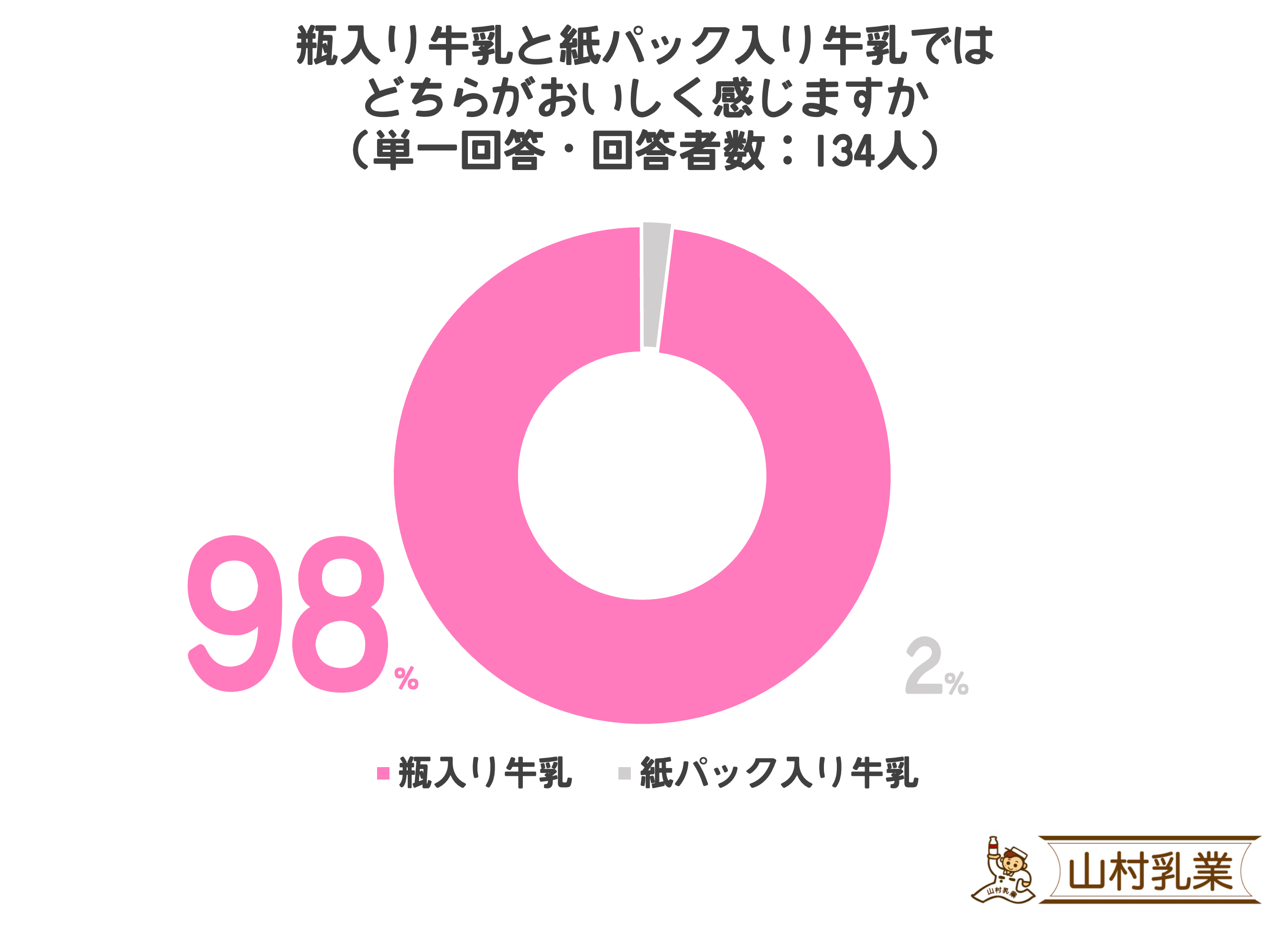 最後に、「瓶入り牛乳と紙パック入り牛乳ではどちらがおいしく感じますか」と聞いたところ、98%が瓶入り牛乳と回答し、圧倒的多数が瓶入り牛乳を支持する結果となりました。口に触れた際の冷んやりとした瓶の感覚や懐かしさを感じる見た目含め、五感を刺激する瓶入りに支持が集まりました。