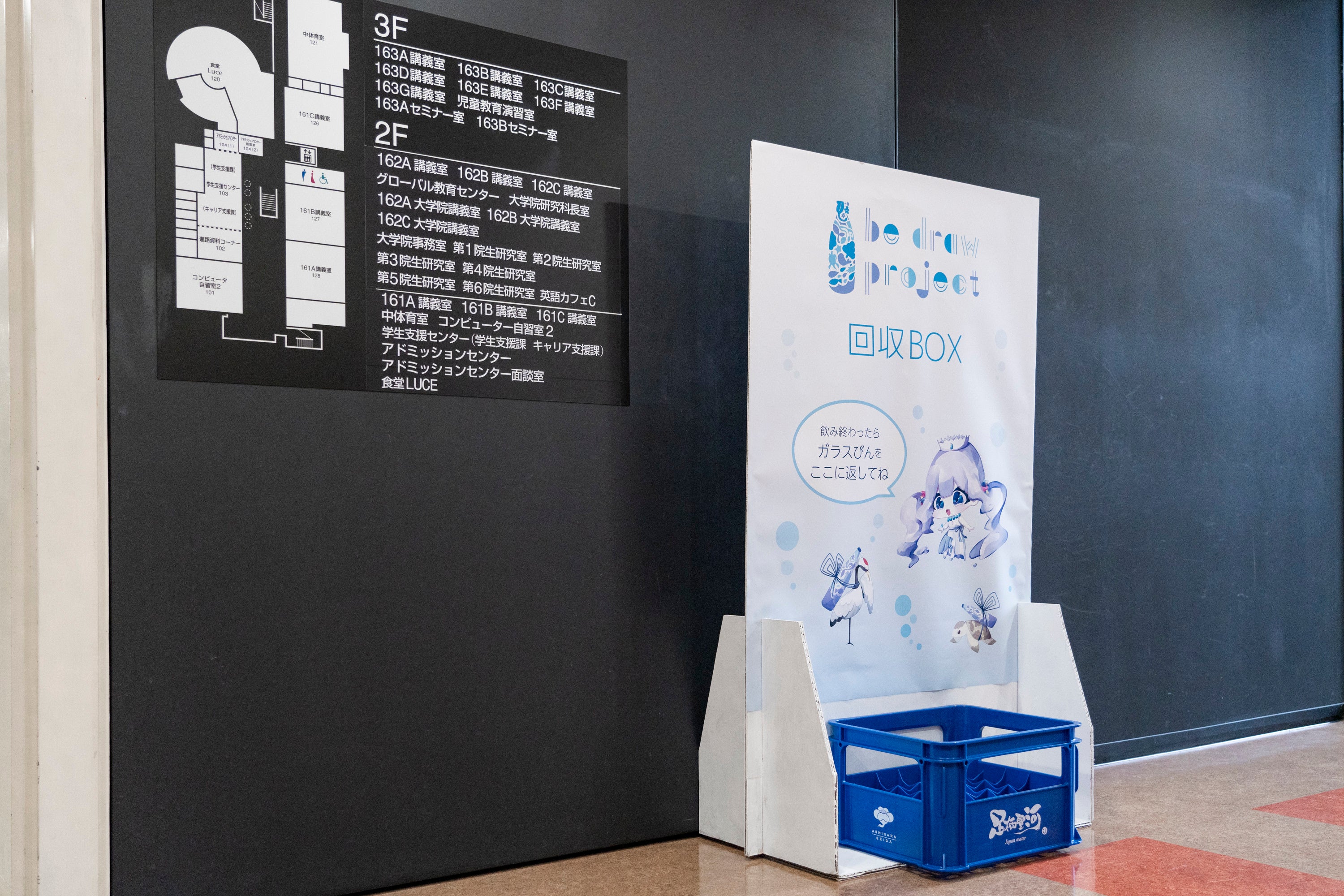 ファミリーマート 東京家政大学店で購入して飲み終わった、足柄聖河を回収できるボックスを3か所学内に設置しています。また飲み終わった王冠で絵柄を完成させていくドロップアート、校内での認知向上を狙ったポスター(6種)を各所に掲出しています。