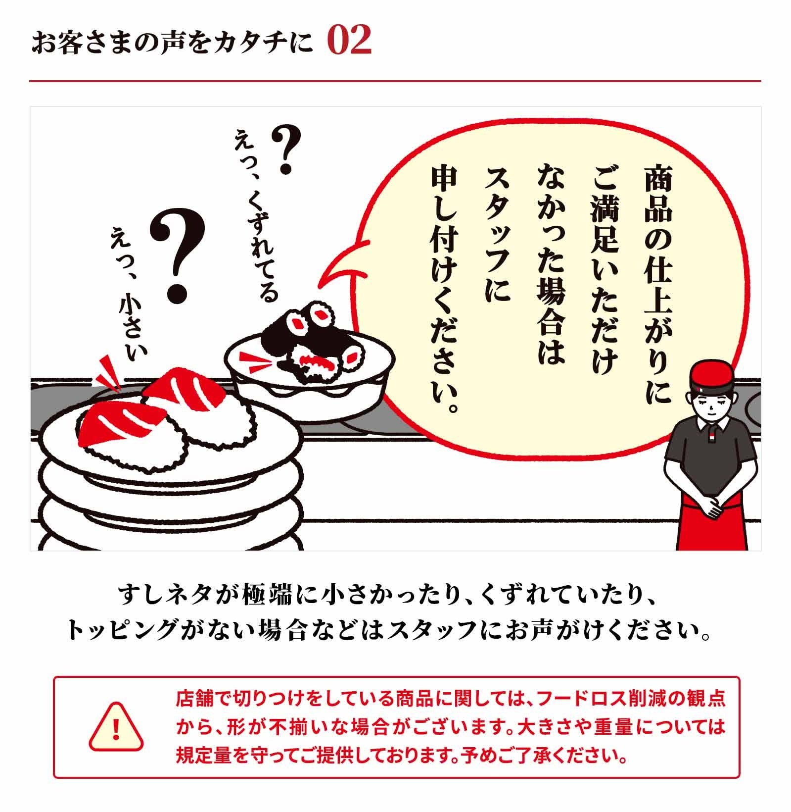 スシローでは「うまいすしを、腹一杯。うまいすしで、心も一杯。」という原点に立ち戻り、お客さまの声をカタチにし、お客さまのために今スシローができる精一杯を提供させていただきたいと考えております。