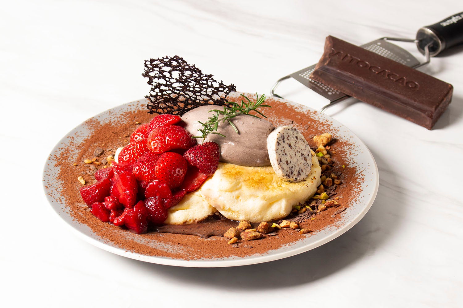 パンケーキの仕上げに削りかけるチョコレートは厳選されたカカオを使用したフランスの【カカオバリー】を使用。お好みに合わせSweet(カカオ濃度38%)またはBitter(カカオ濃度64%)の2種からお選びください。
