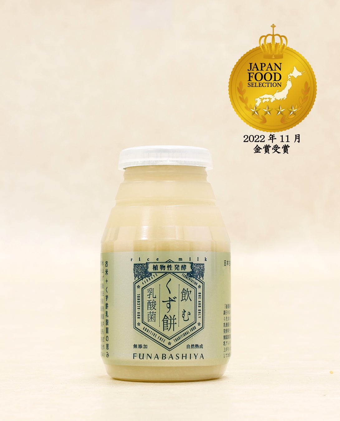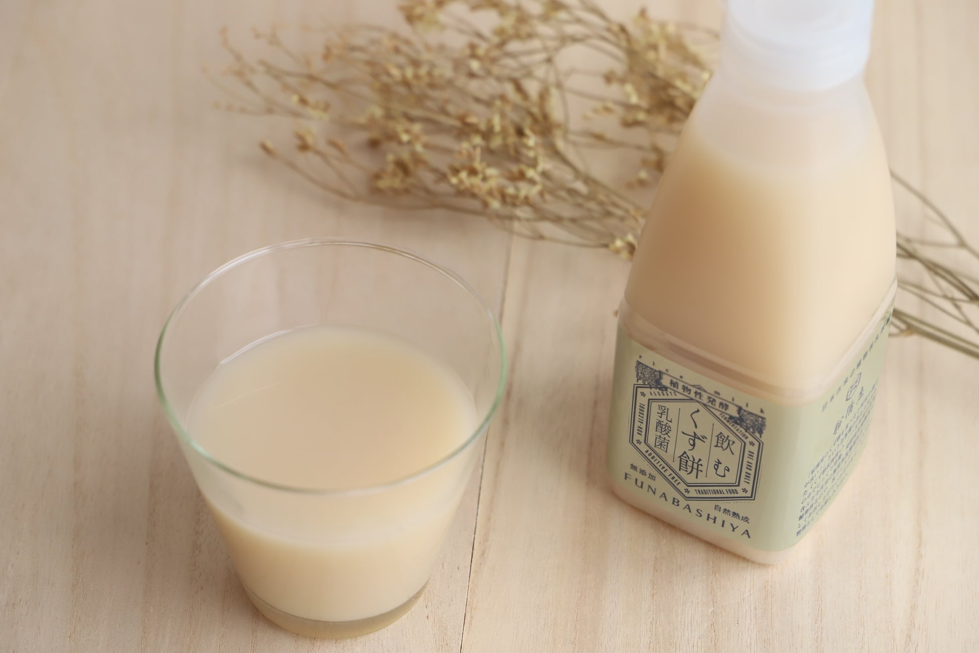 船橋屋の看板商品であるくず餅は江戸から続く和菓子唯一の発酵食品。飲むくず餅乳酸菌はくず餅の発酵槽の中から発見した”くず餅乳酸菌®”を使った身体にやさしいドリンクです。身体にやさしいものをそのままお届けしたいという想いから原料はお米と水・くず餅乳酸菌のみ。砂糖不使用、保存料不使用でお届けします。ほんのり香る甘さはお米のでんぷんが分解されたもの。ボトル内でくず餅乳酸菌が発酵し、アミノ酸など494種の成分を作り出すことで完成します。程よい甘み加減と発酵加減で、熱処理により発酵を止めてボトリングしました。