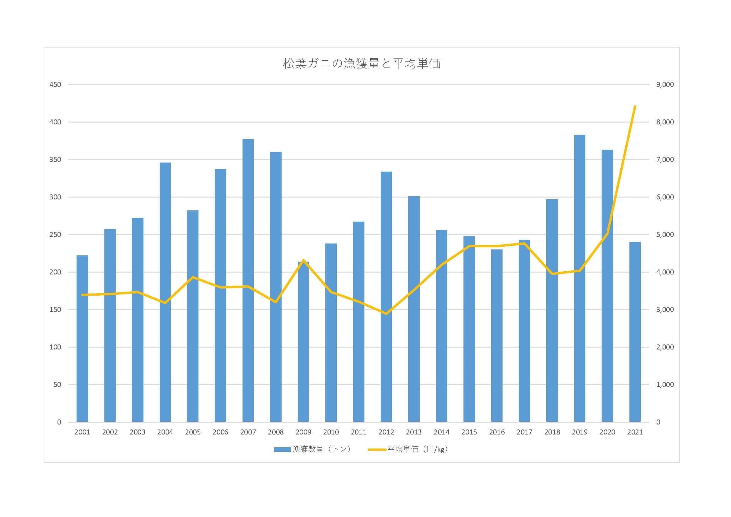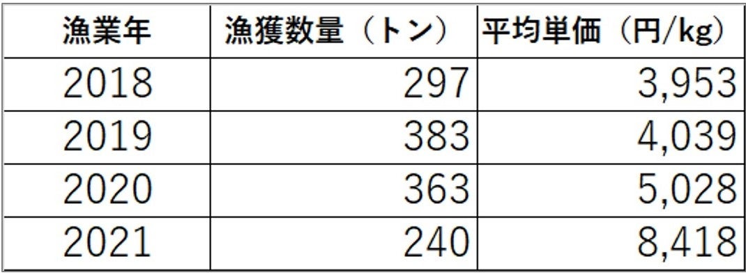 2019年をピークに漁獲量は減少傾向に。昨年は、漁獲量前年比約3割減となり、平均単価は2018年時の2.1倍となりました。