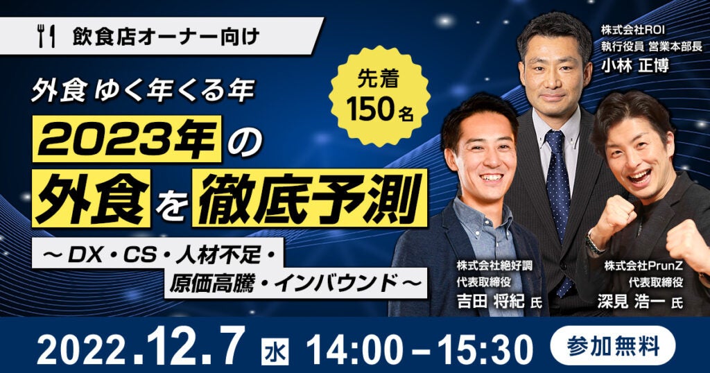 国内最大級の顧客満足度向上プラットフォーム「ファンくる」を運営する株式会ROI(本社:東京都千代田区、代表取締役社長:山口敬人)は株式会社絶好調(本社:東京都新宿区、代表取締役:吉田 将紀)の吉田社長と、株式会社PrunZ(本社:東京都葛飾区、代表取締役:深見 浩一)の深見社長をお迎えし、「外食ゆく年くる年 2023年の外食を徹底予測 ~DX・CS・人材不足・原価高騰・インバウンド~」 (定員:150名/無料)を12月7日(水)に開催いたします。(申し込み先:https://biz.fancrew.jp/seminar_contact5?=pr1)