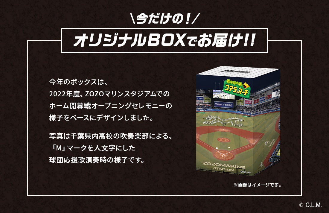 株式会社ロッテは11月18日(金)10時より、毎年恒例となった『マリーンズのマーチ2022ver.』をロッテグループ公式オンラインモール(https://lotte-shop.jp/shop/e/eLmkoala202212/)限定で発売いたします。コアラのマーチと千葉ロッテマリーンズがタイアップし、今シーズン活躍した選手達の記録達成や名シーンを集めた躍動感あふれる10種類のデザインで登場します。2022年度ホーム開幕戦オープニングセレモニーをベースにした特別デザインのBOXに入れてお届けします。マリーンズのマーチ2022Ver.は3,000セット限定となっております。ぜひお買い求めください。