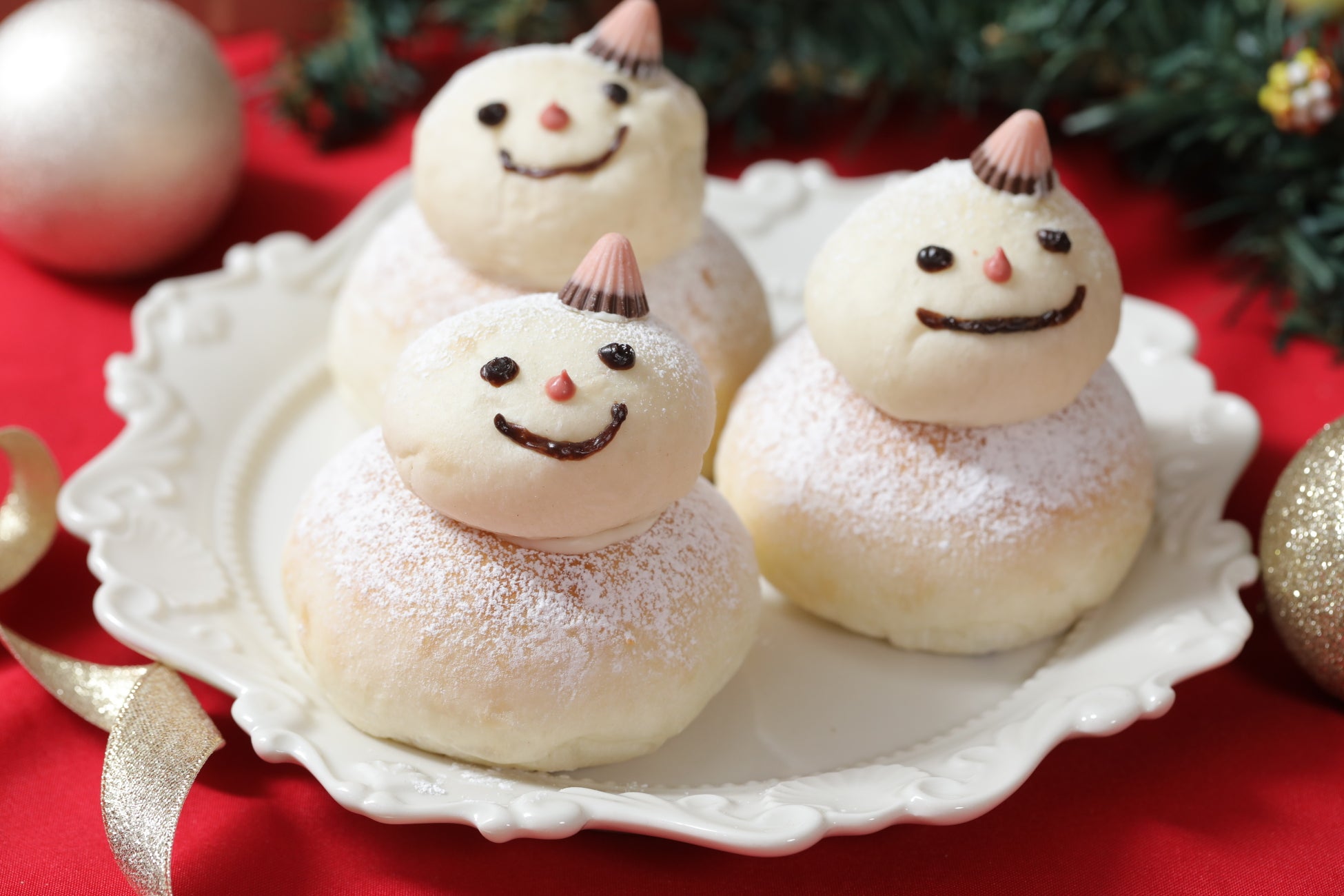 - もっちり、ふんわりとした生地にキュートな笑顔とアポロの帽子をトッピングして、スノーマンに仕上げました。