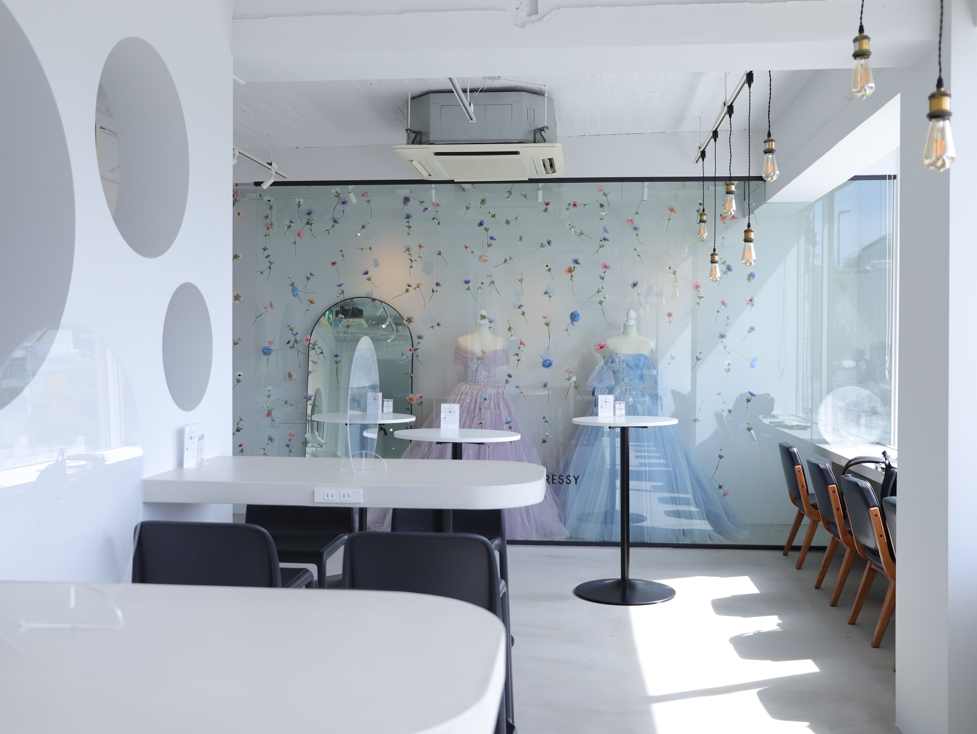 2022年6月にオープンしたばかり。無機質な空間に、ウェディングドレスとお花で彩った写真映えする内装となっており、簡単なキッチン設備・冷蔵庫・冷凍庫も利用可。また無料Wi-Fiとともに、全席コンセントをお使いいただけます。店内でお使いいただけるプロジェクター・延長コードなどもお貸し出し可能となっており、結婚式二次会利用の場合は運営するプラコレウェディングのアドバイザーから直接チャットでご相談も可能(無料)となっており、結婚式二次会以外でも食事ドリンク付きのプランも。営業時間内いつでも見学可能、営業時間外もご相談ください。ご質問、ご相談はカフェ担当 西野までご連絡(0467-81-4587)くださいませ。