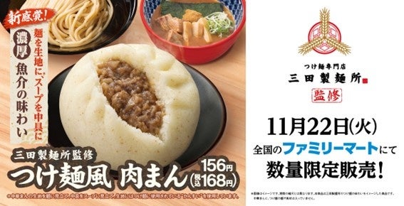 2022年11月22日(火)より、株式会社エムピーキッチン(代表取締役:村上竹彦)が運営する「つけ麺専門店 三田製麺所」の監修商品『三田製麺所監修 つけ麺風肉まん』(税込168円)を、全国のファミリーマートにて発売致します。