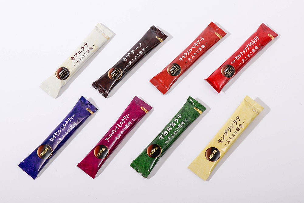 「ネスカフェ ゴールドブレンド 大人のご褒美」は、お湯を注ぐだけで簡単に楽しめるスティックタイプのカフェメニューで、家事や仕事に忙しい毎日を過ごされている皆様に飲んだ瞬間心ほどける「大人のご褒美」としてご満足いただけるよう、味わい、ネーミング、パッケージデザインの全てにこだわり尽くして開発した製品です。22年9月には「モンブランラテ」がラインアップに加わりました。