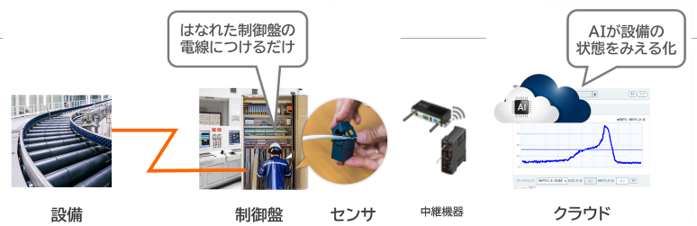 「高調波」のセンシングと「少ないデータで分析できるAI」で、設備の状態を診断するクラウドサービス。設備に直接センサを取り付けする必要が無く、制御盤への設置で利用可能です。