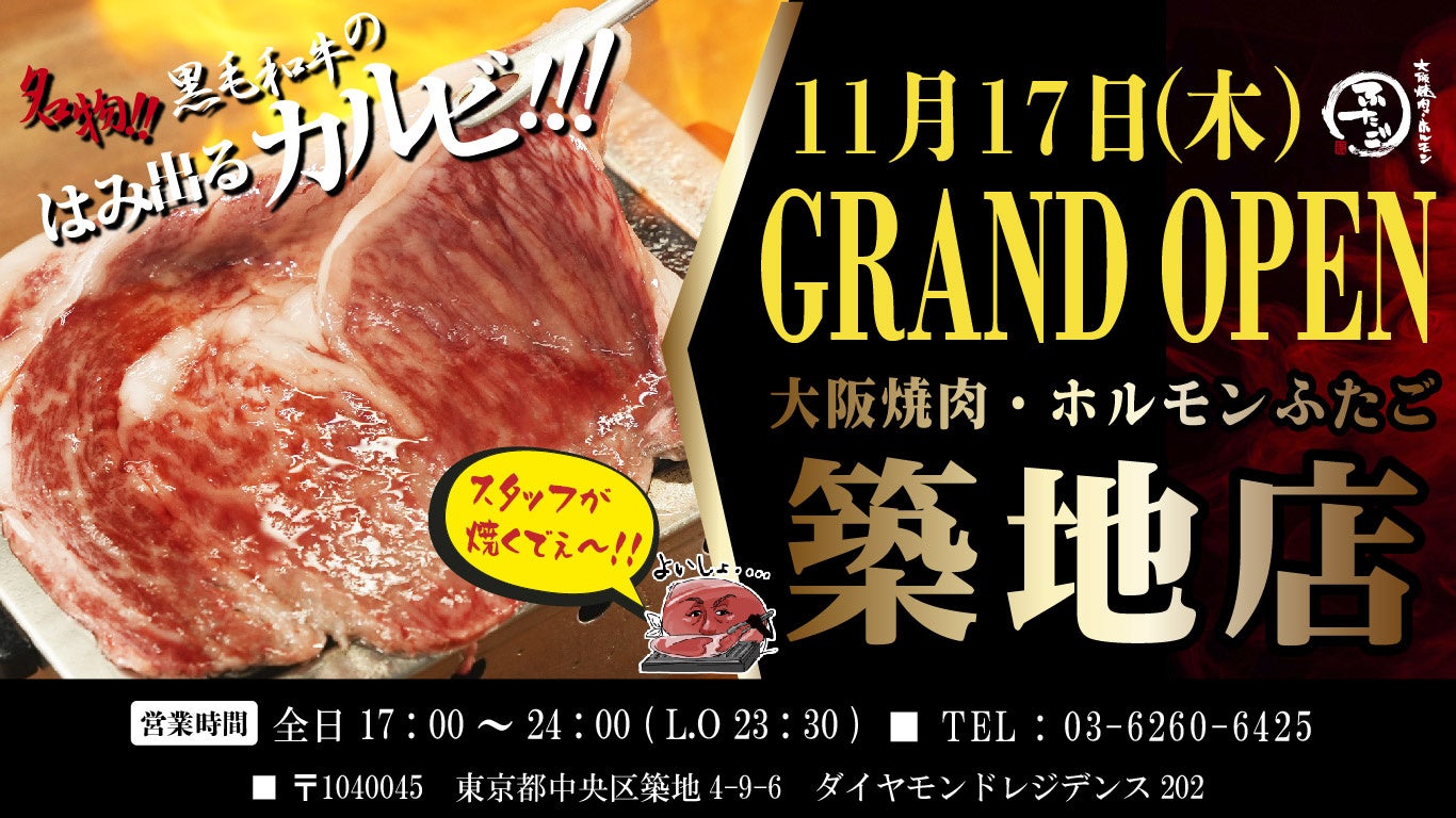 「大阪焼肉・ホルモン ふたご」を世界展開する株式会社FTG Company(本社:東京都目黒区、代表取締役社長:李 純哲)は、株式会社A・Will(本社:神奈川県横浜市)と運営委託型ライセンス契約を締結し、「大阪焼肉・ホルモン ふたご 築地店」を、東京・築地に2022年11月17日(木)グランドオープンします。