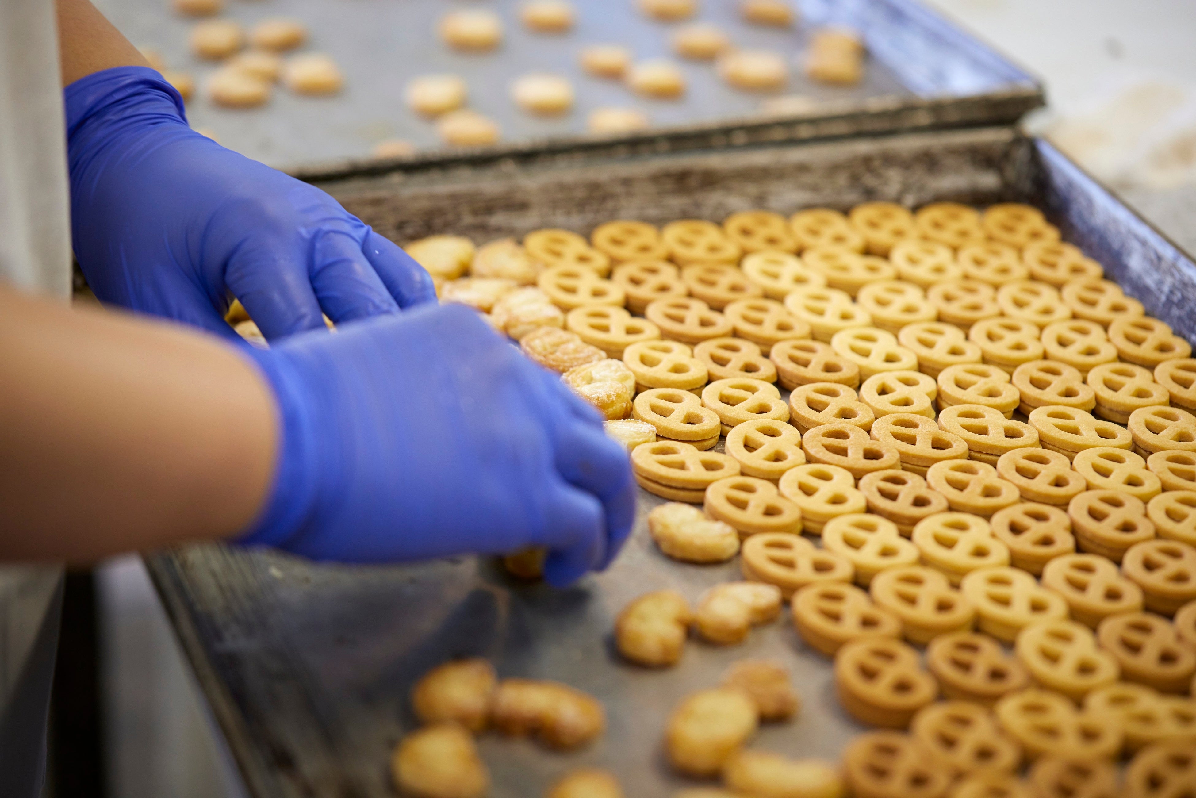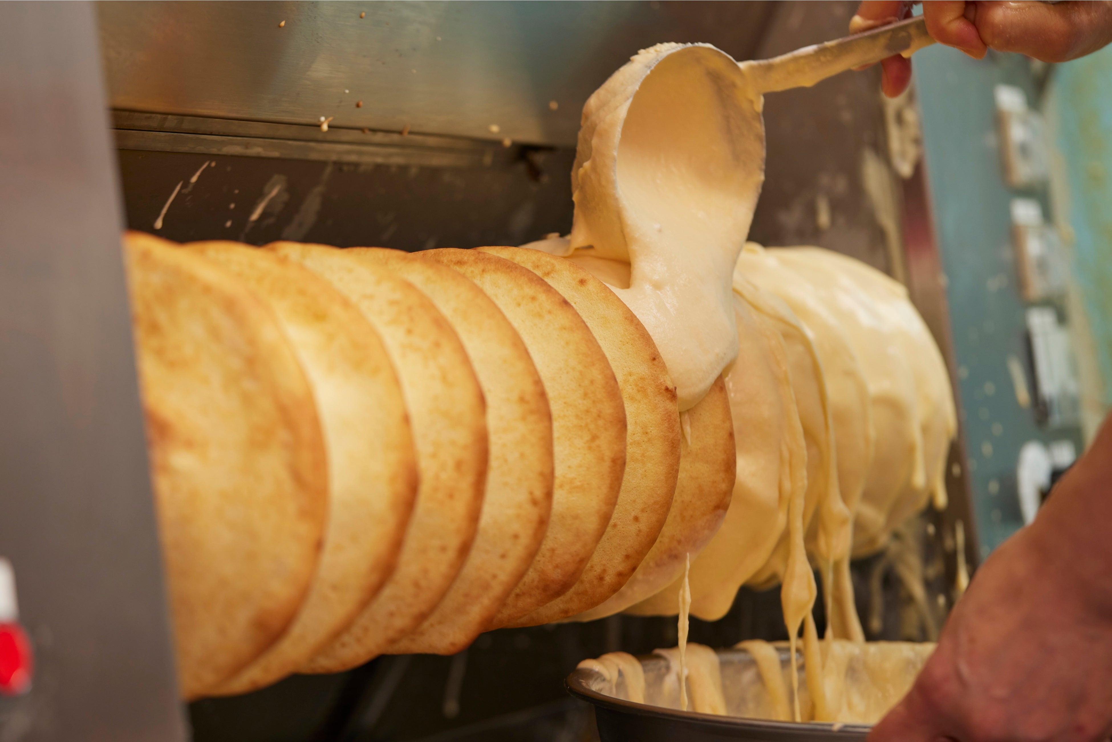 カイザーは余計な物はいっさい加えず、ひとつひとつ手づくりしています。樫の木の芯棒に薄い生地をかけていく作業を幾度も繰り返し、そろばん玉をつないだような形に焼き上げていきます。