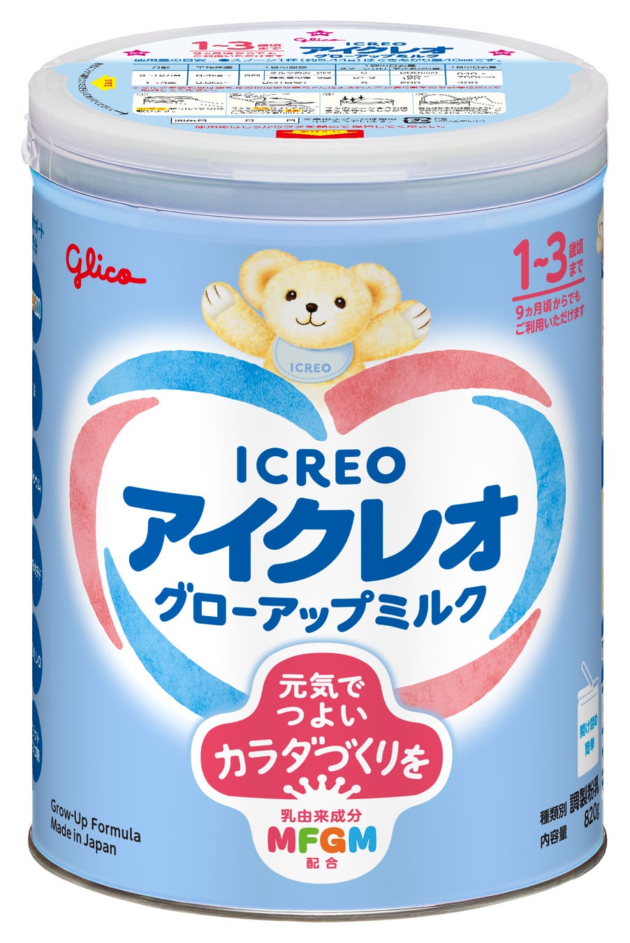 「アイクレオ グローアップミルク」は、1歳頃※から3歳頃までを対象としたミルクで、食事やおやつと一緒に摂ることで発育をサポートする商品です。本商品の最大の特長は、発育サポート成分「MFGM(Milk Fat Globule Membrane;乳脂肪球皮膜)」の配合です。MFGM は、⺟乳にも含まれる物質で、お子様のカラダを守る成分が含まれた乳由来成分です。「免疫発達期」の体調管理をするためには、元気でつよいカラダつくりをサポートすることが必要であるとの考えから、当社ではMFGMに注目しその研究を進めてきました。