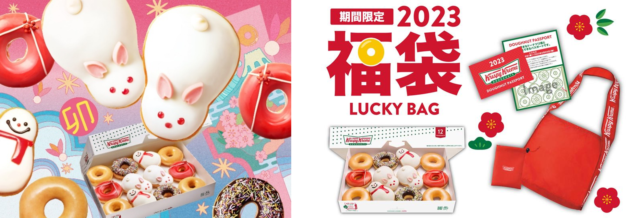 クリスピー・クリーム・ドーナツ・ジャパン株式会社(本社:東京都渋谷区、代表取締役社長:若月 貴子、以下:KKDJ)は、新年を迎えるにあたり、年末年始限定のドーナツを『HAPPY JUMP! ETO DOZEN』プロモーションと題し、クリスピー・クリーム・ドーナツ店舗※1において、2022年12月26日(月)から期間限定で販売します。また、毎年人気の『クリスピー・クリーム・ドーナツ 福袋 2023』を今年も販売します。2022年11月22日(火)より、公式アプリ内の「クイック オーダー」にて事前予約販売を開始。2023年1月1日(日)~3日(火)の3日間は一部店舗にて、店頭販売※2も実施いたします。