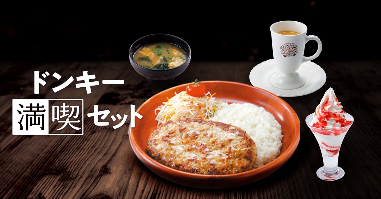 「ドンキー満喫セット」は、家族、親戚、友人と集まる機会の多い年末年始の時期に、びっくりドンキーのこだわりが詰まった商品を一度に楽しんでほしいという想いを込め、ハンバーグディッシュ、スープ、ドリンク、デザートを自由な組み合わせで一度に味わうことのできる期間限定のセットメニューです。