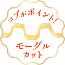 冬に適したポテトチップスを目指し、行き着いたカット「モーグルカット」が特長です。モーグルはコブを意味しており、大きな凹凸のコブができるようにカットすることで、冬らしいサクサクとした食感とほろほろとした口どけを実現しました。お客様への調査でも“ほろほろと崩れて雪のような食感”と評価いただいております。さらに、 日本音響研究所の調査で、「冬ポテト」を食べた時の音が“新雪を踏む音”に似ていることがわかるなど、まさに寒い季節にぴったりの商品です。