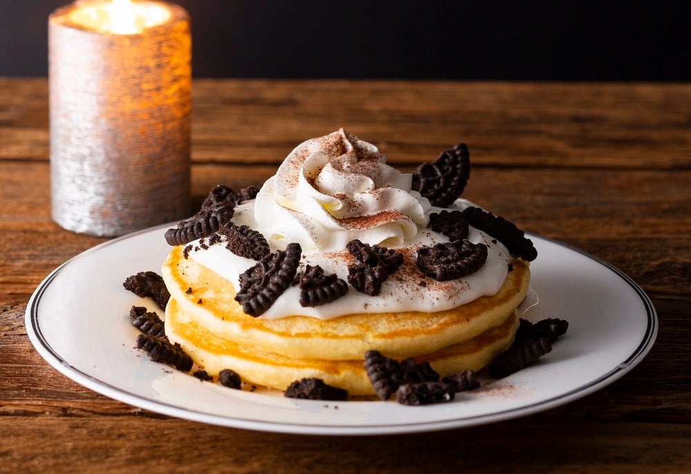 スイーツでは定番の味わい“クッキー&クリーム”をパンケーキでお楽しみいただけます。ふんわりパンケーキにクッキーのサクサク食感がアクセントになっています。