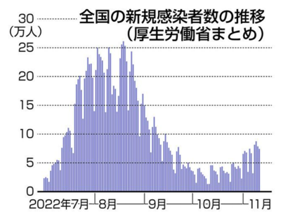 厚生労働省のまとめでは、1週間(11月5日~11日)の全国の新規感染者数は約49万4000人でした。前週比は1.43倍で、1週間前の4日時点(1.32倍)より拡大。増加ペースが上がり、第8波への懸念が高まっています。https://www.tokyo-np.co.jp/article/213614(引用:東京新聞)