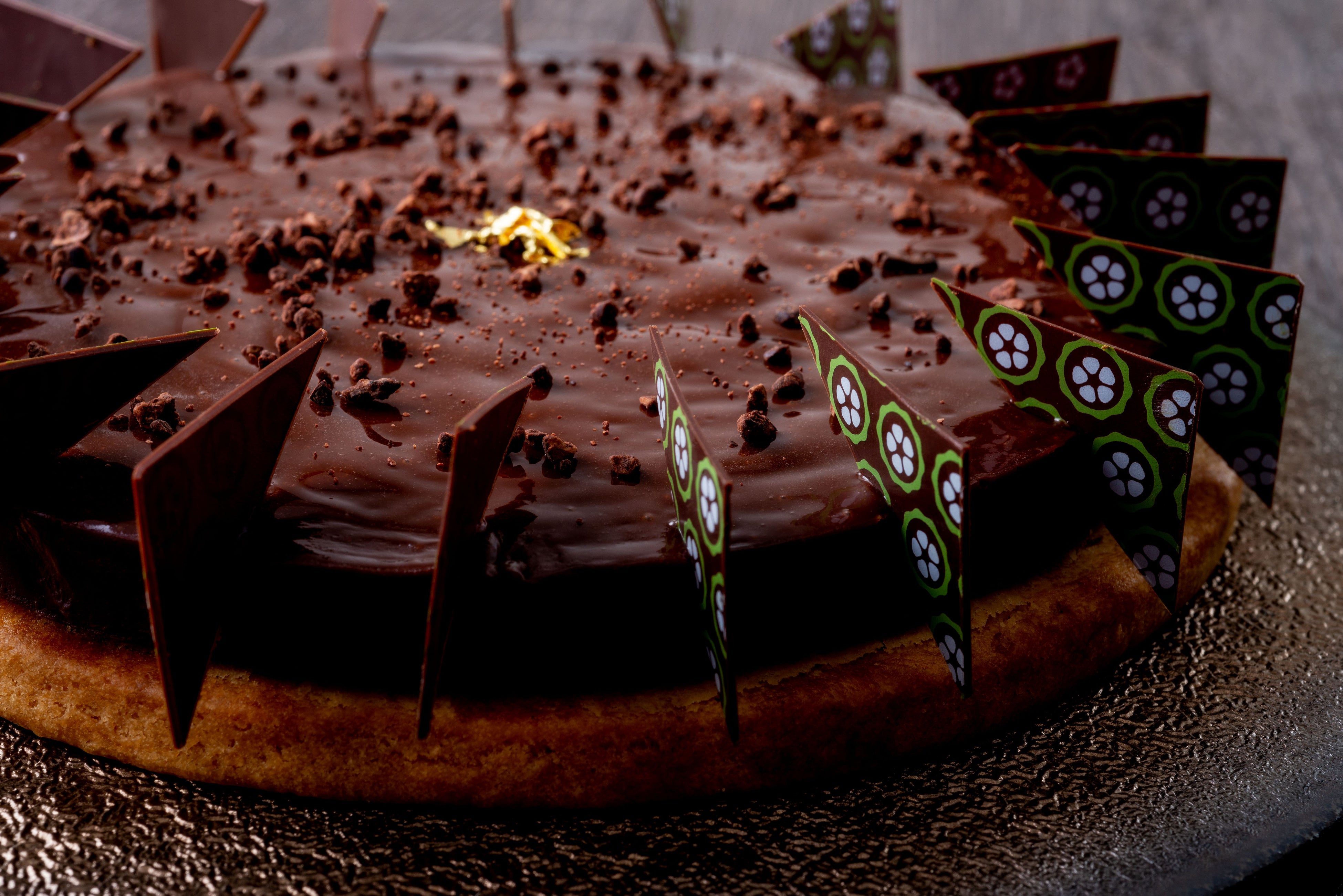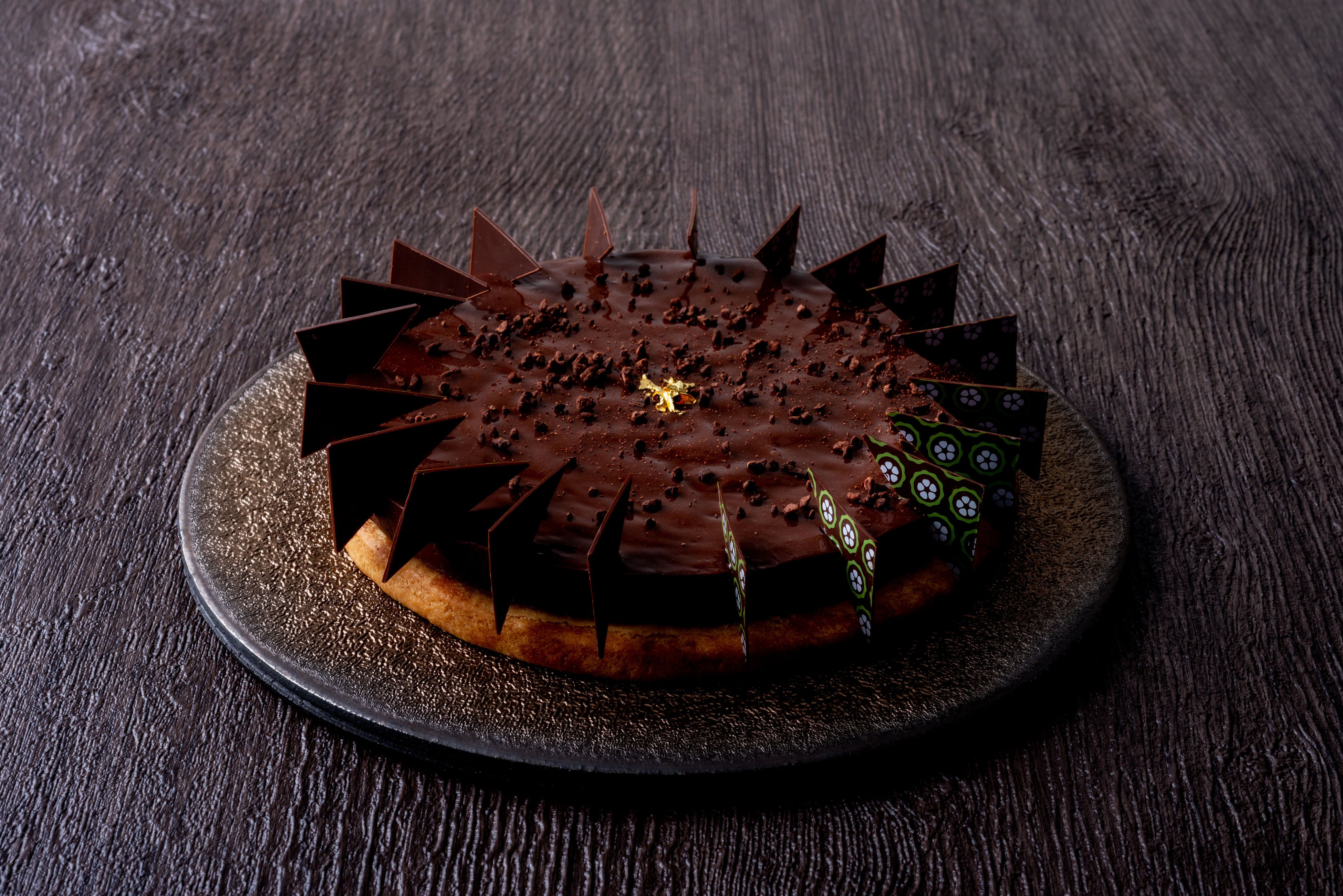 タルトのサクサク感とオリジナルチョコレートを使用したガナッシュのなめらかさ、ロゴ入りのチョコレートプレートの食感を楽しめます。金箔とカカオニブをあしらいシックなデザインに仕上げました。