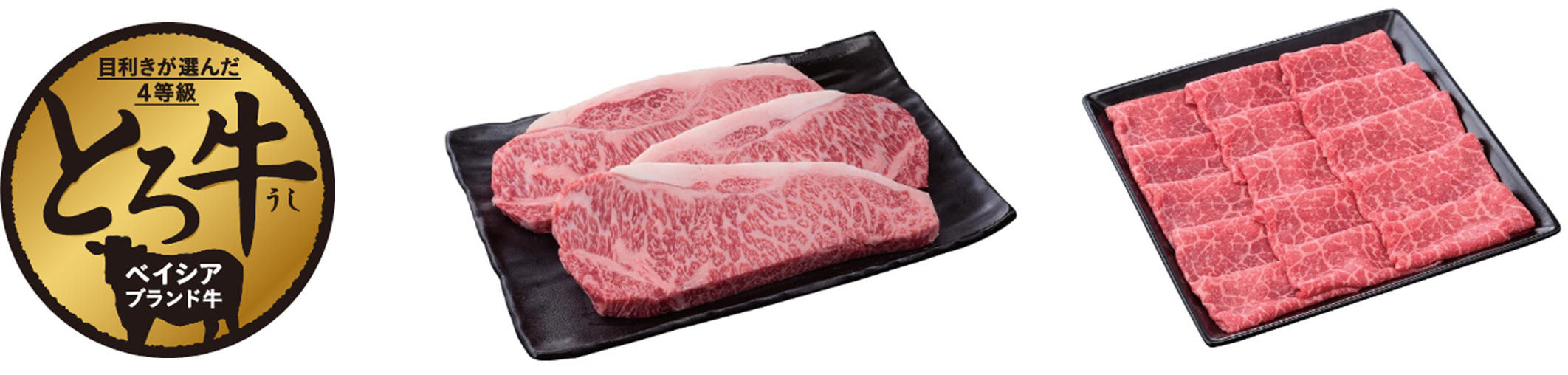 大田原店からオリジナルブランド牛「ベイシア とろ牛」が初登場。プロの目利きが厳選した肉質4等級の牛を一頭買いすることで、赤身から霜降り肉まで、高品質で鮮度の高い様々な部位のお肉が揃います。