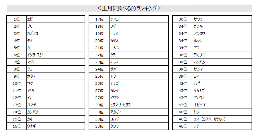 識者の意見を交え実施した、2007 年「伝統料理とおせちの調査」並びに 2011 年「正月・祝い・普段の魚料理調査」の結果を踏まえ、近年のおせち料理における、魚介類の出現率を計測するため、両調査で実施した選択肢をできる限り採用し、本調査を行いました。