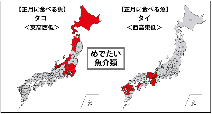 タコは14位まで東日本が独占し15位以降に鹿児島、滋賀、熊本の3県がランクインする圧倒的な東高西低の結果となりました。タイは瀬戸内海に沿った地域が高く、20位内に秋田が入るのみでこちらも圧倒的な西高東低の結果となりました。