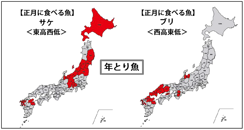 共に東西を代表する年とり魚。大晦日にはごちそうを用意して正月の歳神様を迎える準備をする風習があります。「年とり魚」と呼ばれるサケやブリを、塩漬けにするなど工夫して遠くまで運んでいました。