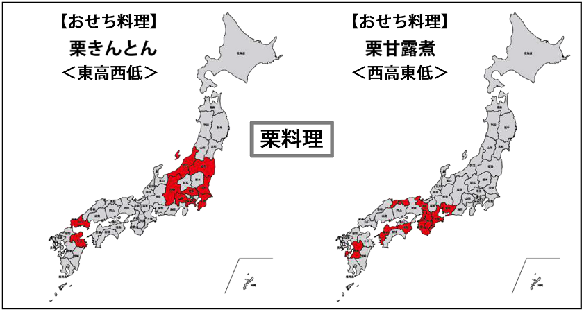 ここからは、調査を実施した50種類のおせち料理の用意率について、それぞれ上位10都道府県を算出、地図化して、東西に分かれるなどの特徴を持つおせち料理を選んで比較してみました。