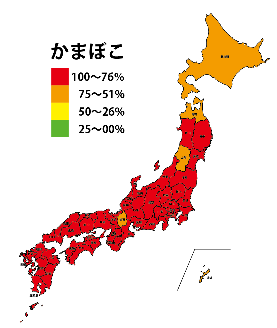 なると巻は20位内をみても東日本の北海道、東北、関東地方で上位を占めた東高西低の結果となりました。かまぼこは上位を九州と中四国がほとんどを占める西高東低の結果となり、おでん種と同じ傾向が見られました。