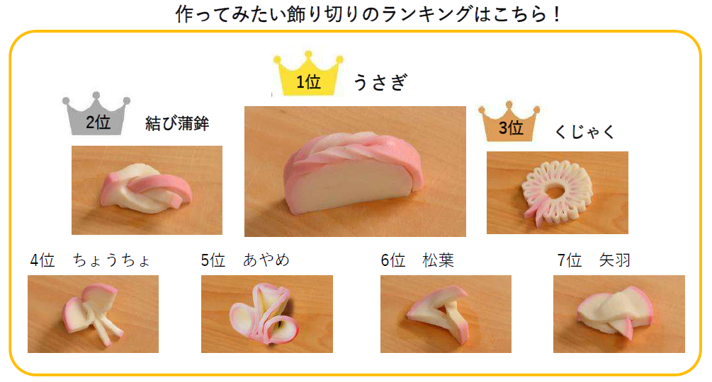 おせち料理の中でかまぼこは日の出を象徴するとされ、紅色は慶び、白は神聖を意味するとされています。今回の調査で、かまぼこを使った7種の飾り切りについて「作ってみたいもの」を聞いたところ、2023年の干支でもある「うさぎ」が1位になりました。