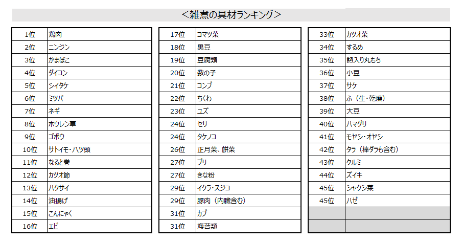 雑煮に入れる具材のベスト20には、野菜では根菜類としてニンジン・ダイコン・ゴボウ・サトイモ(八ツ頭)、葉茎菜類としてミツバ・ネギ・ホウレン草・ハクサイ・コマツ菜、キノコ類としてシイタケがランクインします。