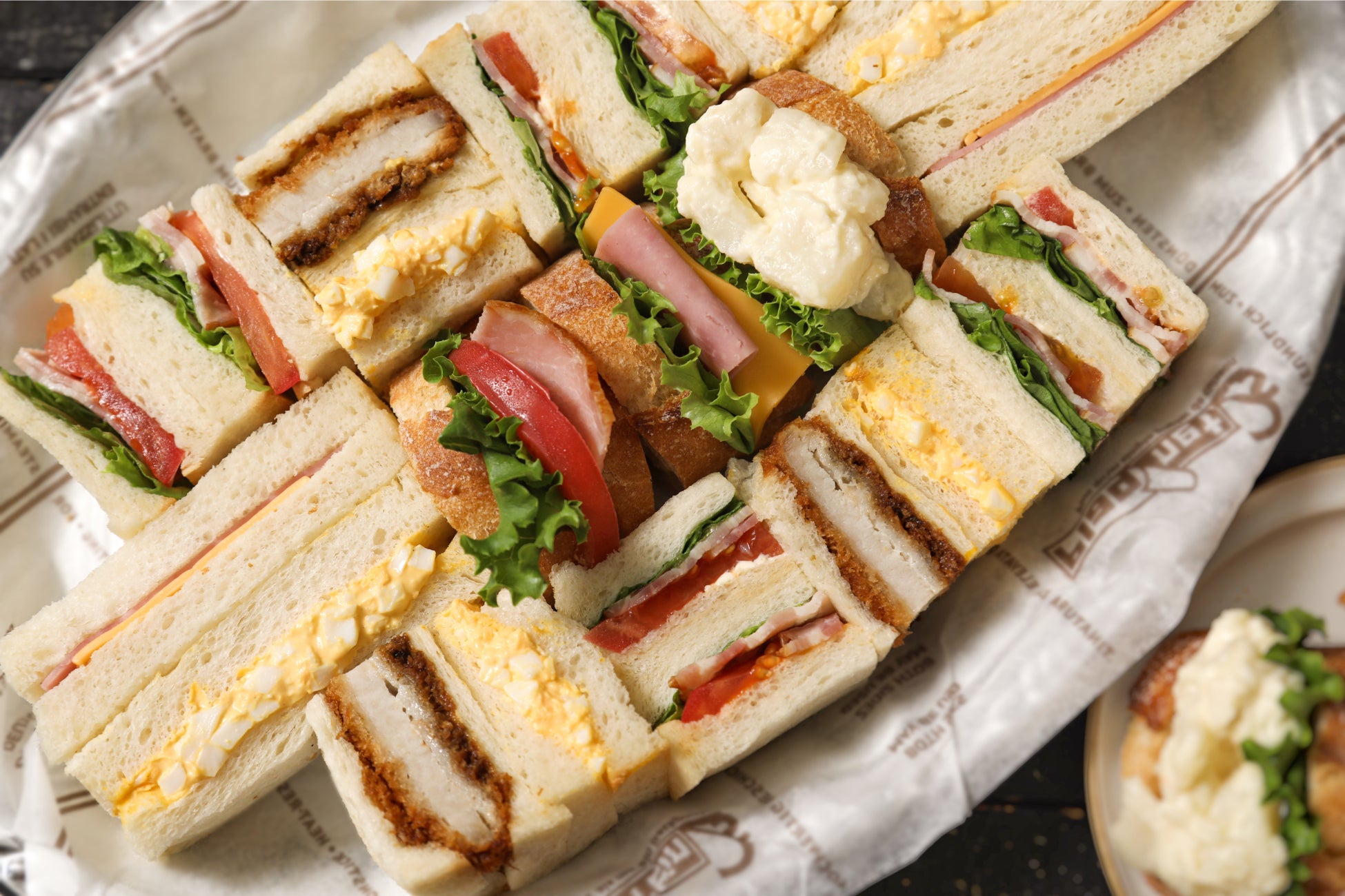 - 人気のサンドウィッチ(カツ、ハムチーズ、タマゴ、BLT、バゲットサンド(ポテトサラダ、ハム&チーズ、BLT))の計23切を詰め合わせた彩り豊かなセット内容です。