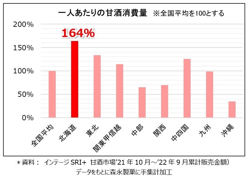 北海道は甘酒が大変に好まれている地域で、一人あたりの甘酒消費量は全国で一番多く、全国平均の約1.6倍*です。また、北海道の甘酒市場において、森永製菓のシェアは約8割※で全国平均(約3割※)を大きく上回ります。そして、おなじみの赤い缶の「甘酒」が、北海道の甘酒市場のシェアの約6割※を占めており、北海道の皆様に一番支持の高い甘酒です。