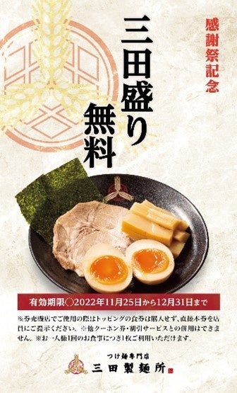 期間中ご来店頂いた方には、11月25日(金)以降ご利用できる『三田盛り(全部乗せトッピング)無料券』を進呈致します。