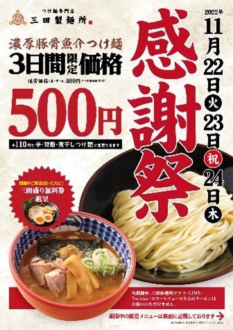 2022年11月22日(火)から24日(木)の3日間、株式会社エムピーキッチン(代表取締役:村上竹彦)が運営する「つけ麺専門店 三田製麺所」は、人気商品・濃厚豚骨魚介つけ麺が通常880円のところ、限定価格の500円にて提供する『感謝祭』を4年ぶりに開催致します。