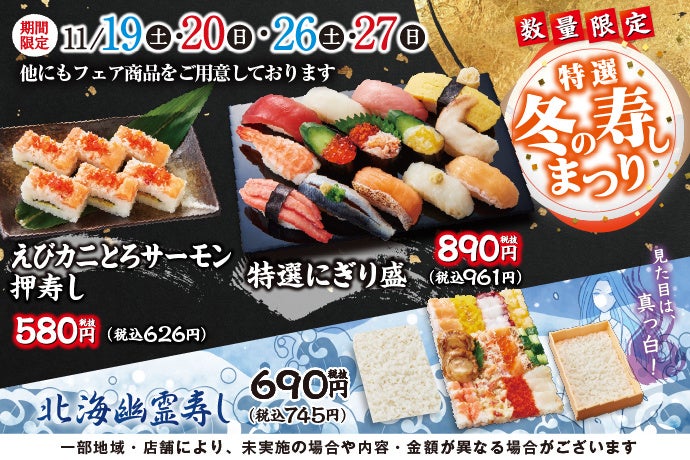 持ち帰り寿し店の「小僧寿し」「茶月」を運営する株式会社小僧寿し(本社:東京都中央区 代表取締役社長 良本 宣之)は、持ち帰り寿し店「小僧寿し」にて、11月19日(土)・20日(日)・26日(土)・27日(日)の期間限定で、『特選冬の寿しまつり』を開催致します。
