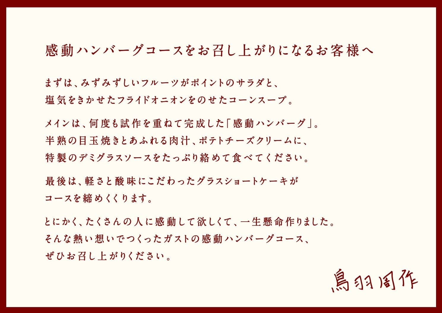 『感動ハンバーグコース』をご注文の方には、感動ハンバーグコースに込めた想いが書かれた鳥羽周作シェフからのメッセージカードを進呈いたします。