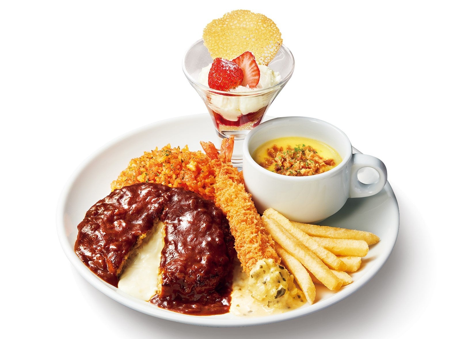 フルーツの酸味やナッツの食感がアクセントのシュリンプサラダ、程よい塩味で甘さを引き立てたコーンポタージュ。そしてメインは、ガスト史上最大級の厚みのトリュフ香るポテトチーズクリームIN感動ハンバーグ。最後は、軽さと酸味のバランスにこだわったグラスショートケーキで締めくくります。