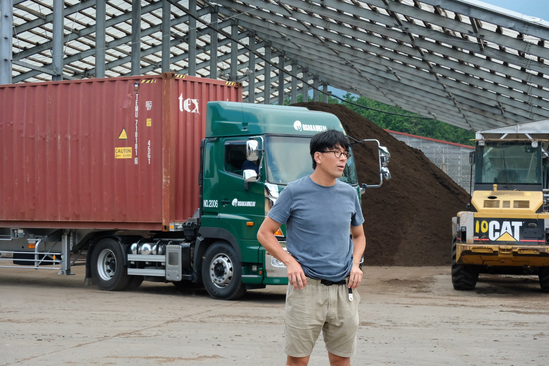 ▲朝霧メイプルファームの敷地内は常にトラックが行き交い、餌の搬入、堆肥の搬出が行われている。ここでは1日約2.5トンの餌が消費される。