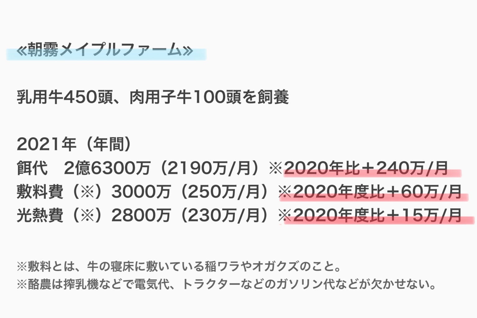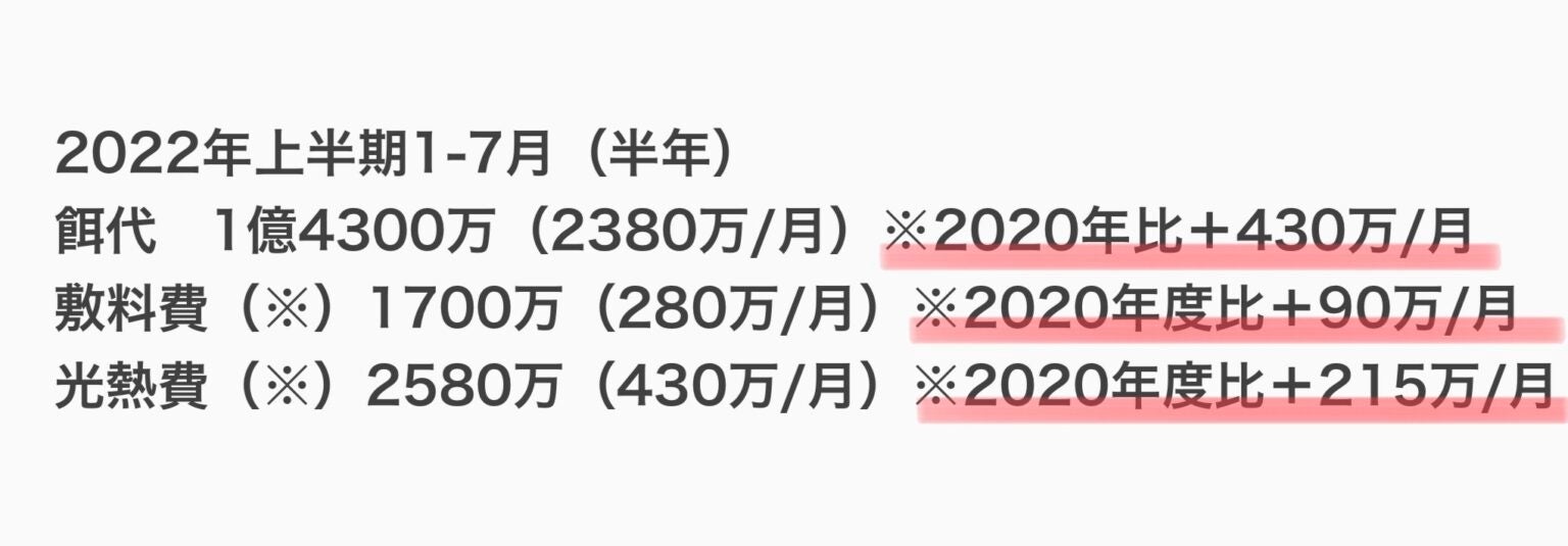 2020年に比べ、餌代だけでも月に240万円上がっている。