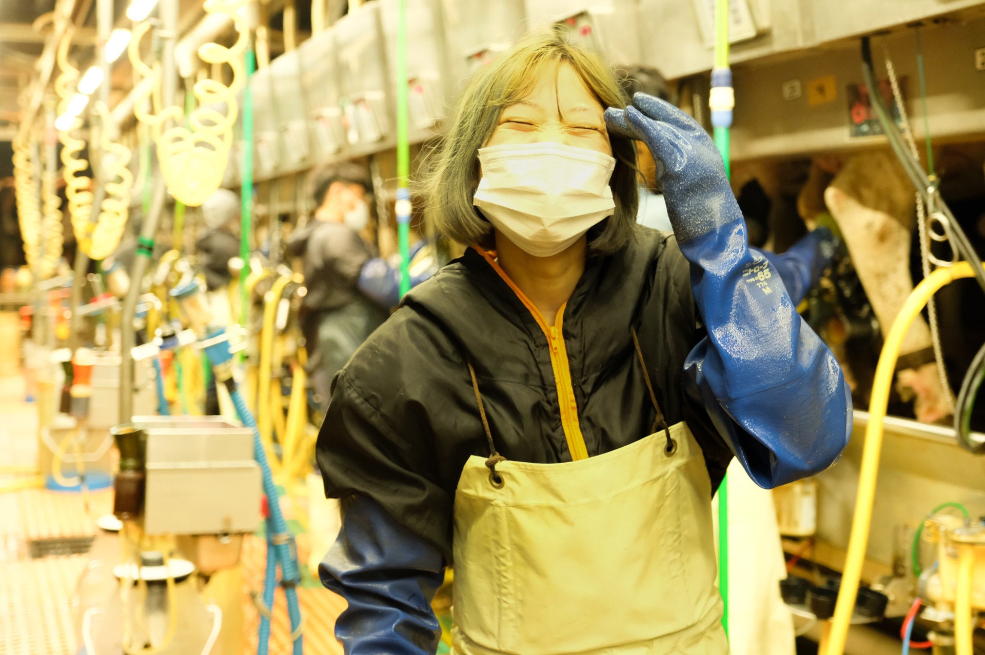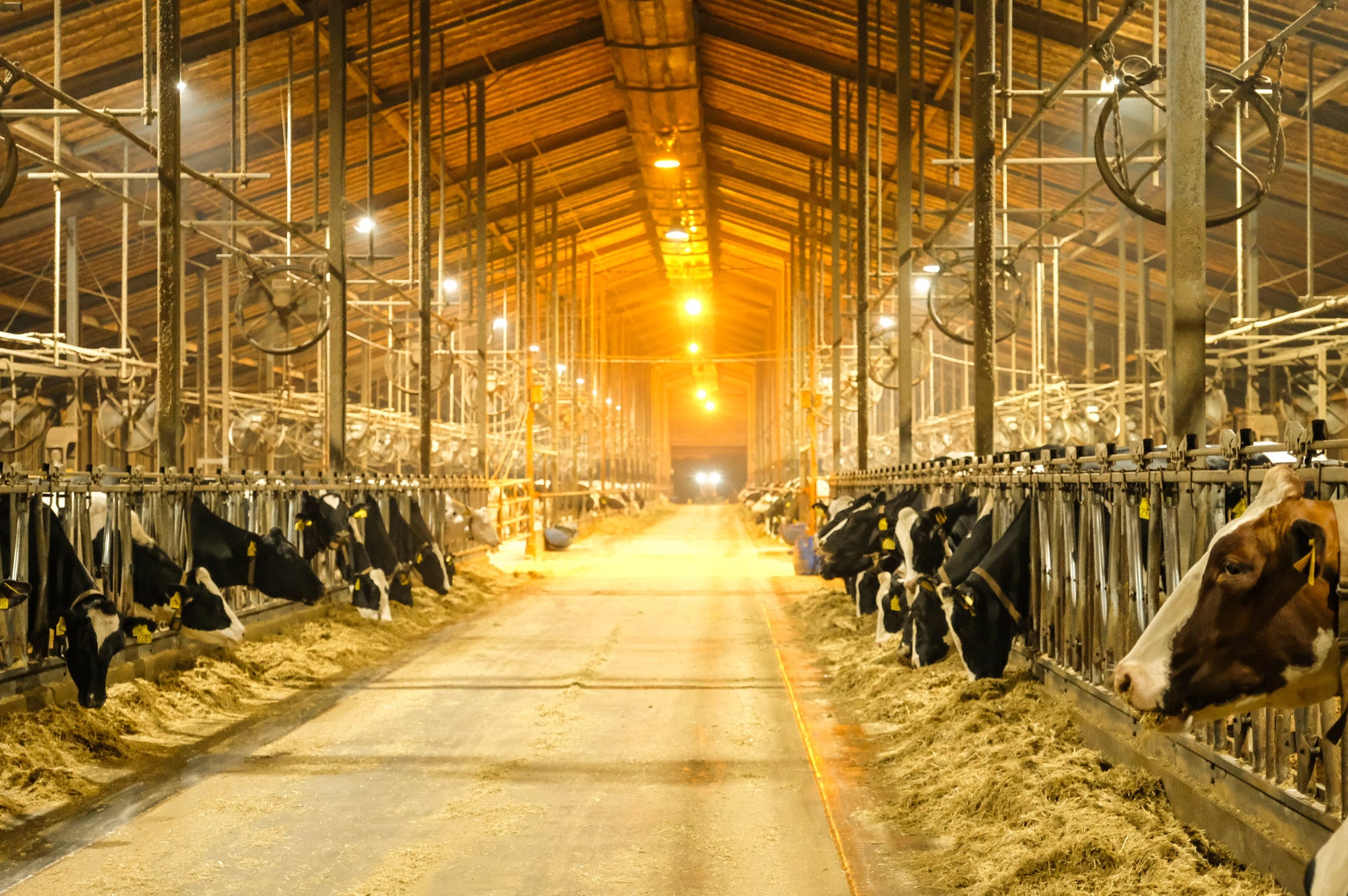 ▲ここでは1日3回搾乳が行われる。チーム制で1時間に150頭の牛を効率的に搾乳。夜の牛舎はまるで映画のワンシーンのようだ。